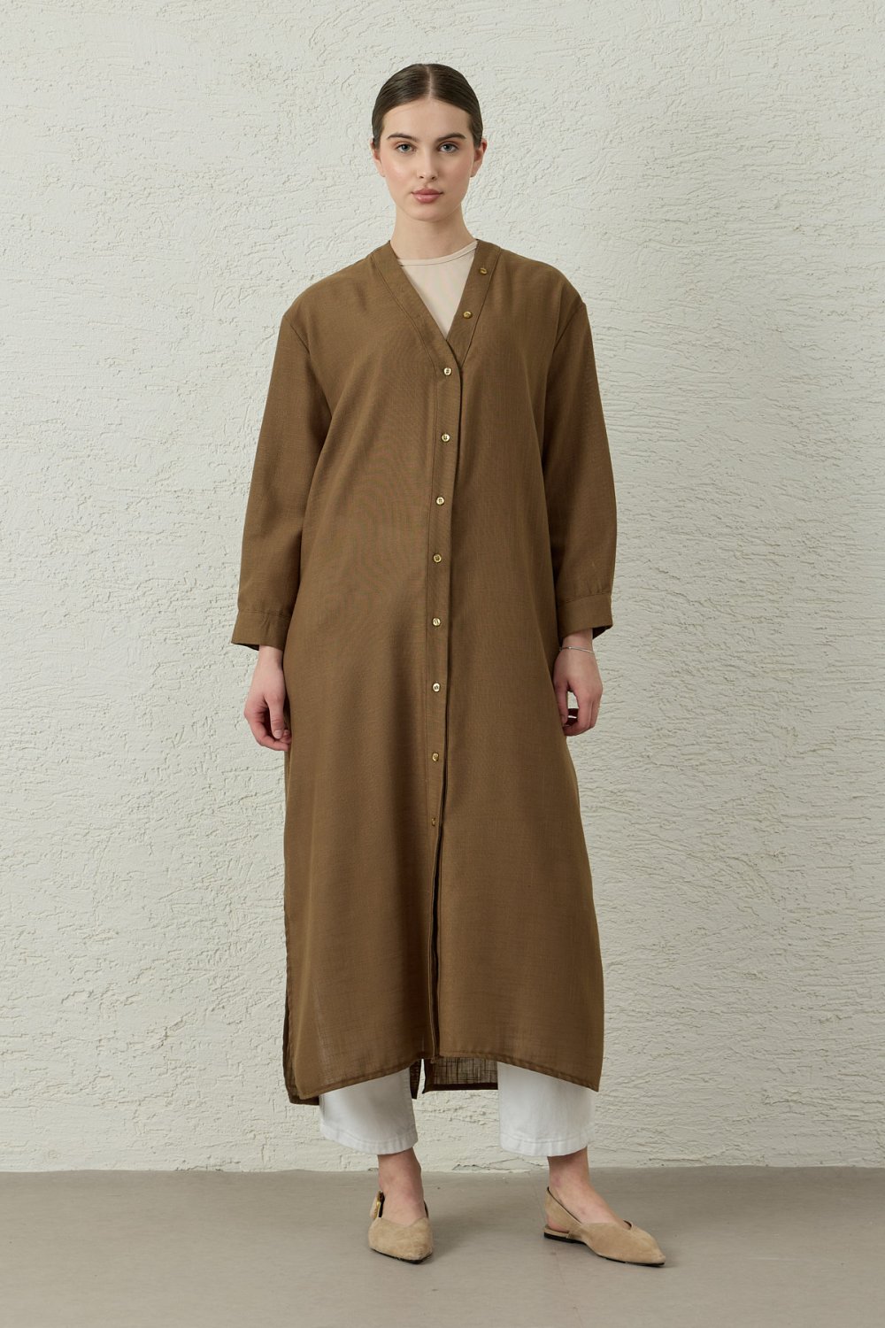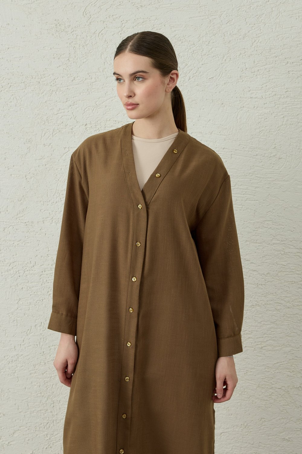 ✔ Ahşap düğme detaylarıyla zarif tasarım