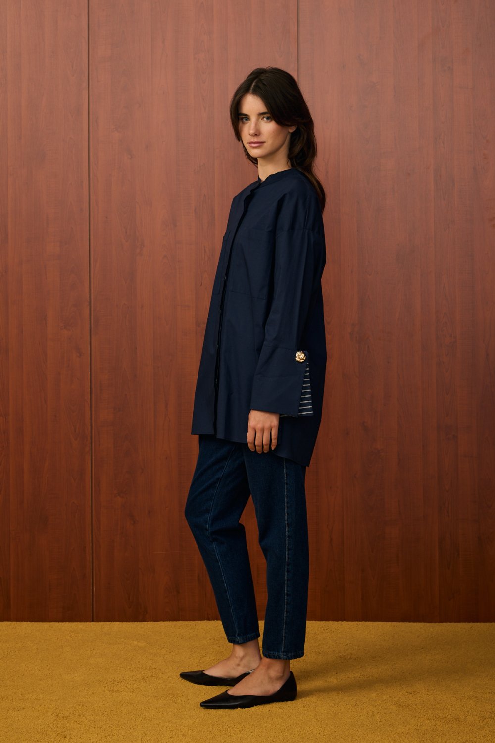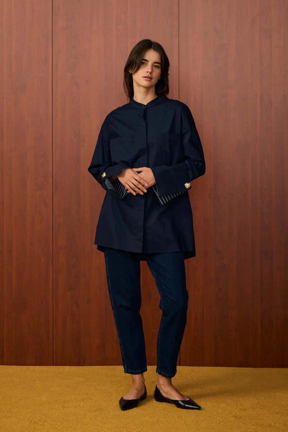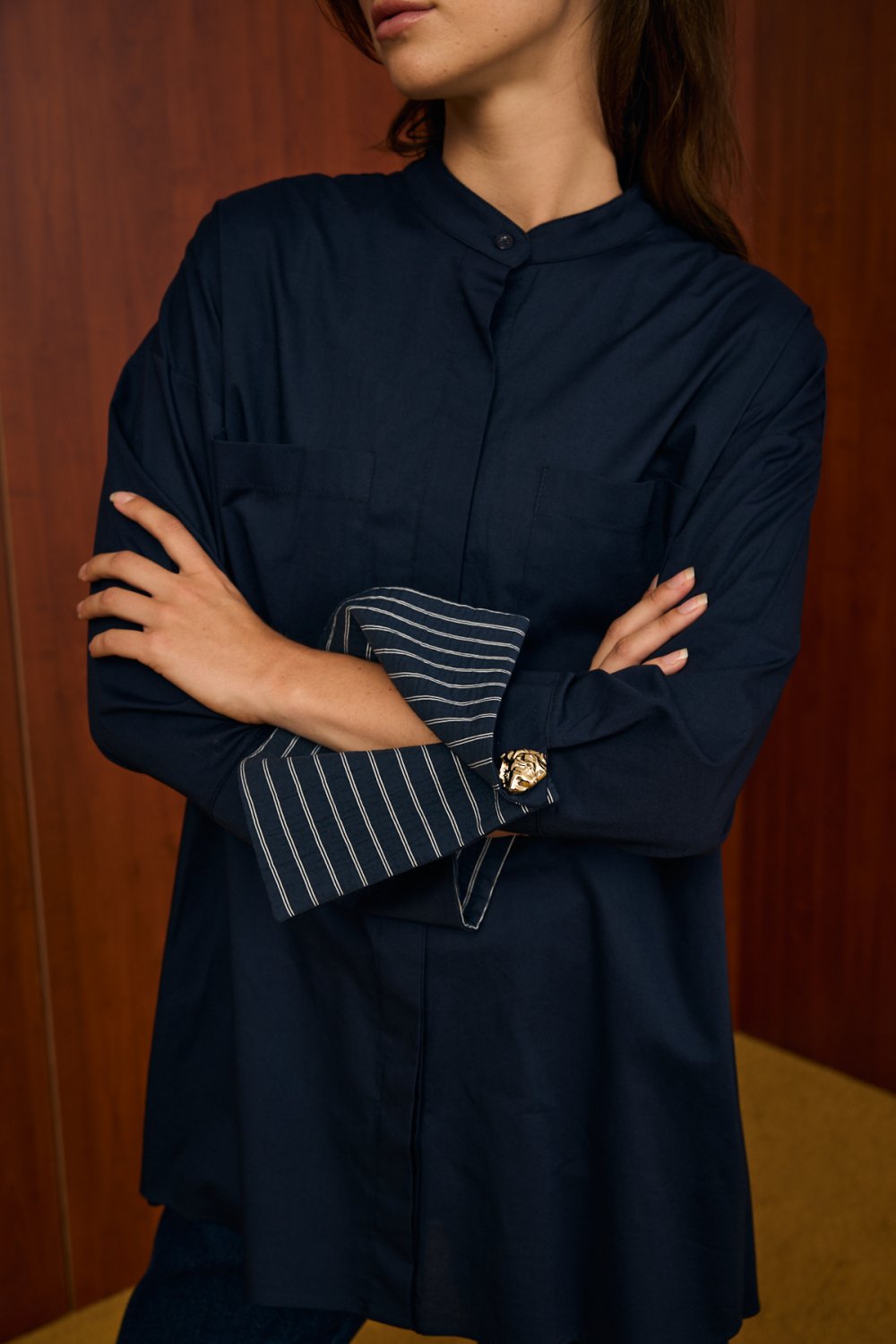 • Kol Detayı: Uzun kolludur. Manşet kısmı geniş tasarlanmış olup, üzerinde süs düğme/aksesuar detayı bulunur. Bu detay gömleğe şık ve modern bir görünüm kazandırır.