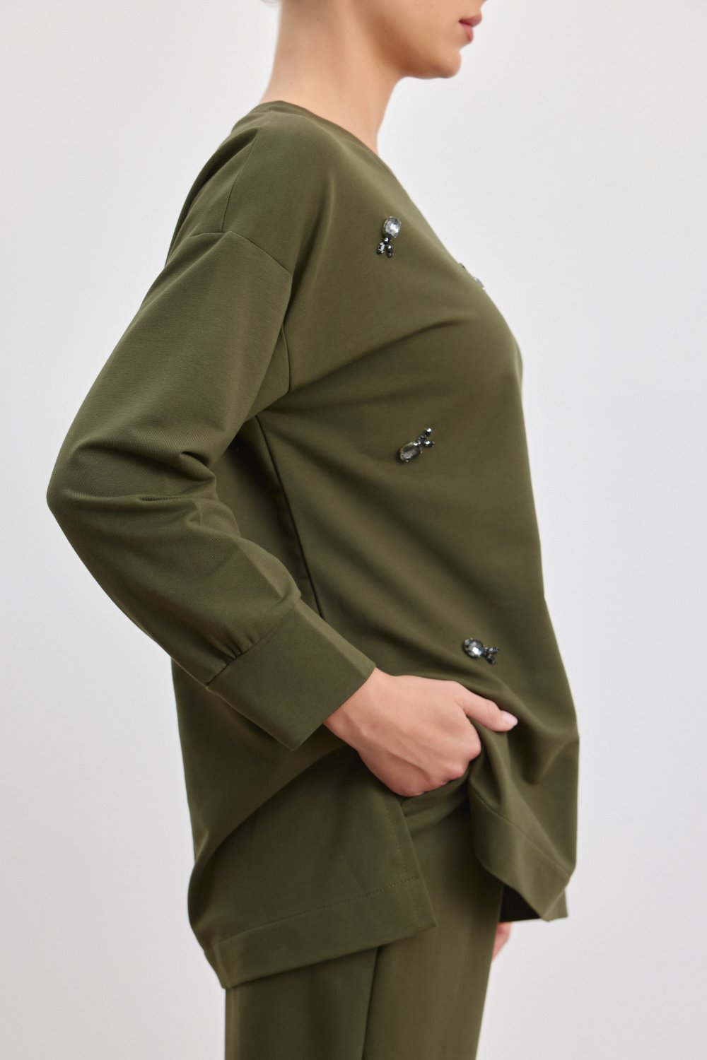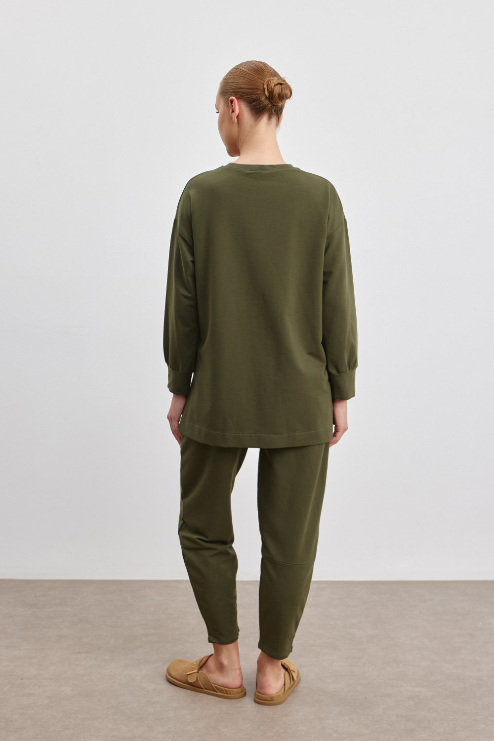 Rahatlığı ve şıklığı bir araya getiren bu koyu haki takım, günlük stilinize zarif bir dokunuş ekliyor. İki iplik kumaştan üretilmiş bu takım, yumuşak dokusuyla gün boyu konfor sağlar. Üst kısmı 73 cm, alt kısmı ise 100 cm uzunluğundadır ve bol kesimi ile rahat hareket etmenizi sağlar. Minimalist tasarımı ve üzerindeki zarif detaylarla dikkat çeker. Bedenlemeler 1/2 olarak sunulmuştur ve modelin boyu 174 cm olup, üzerindeki beden 1 dir.