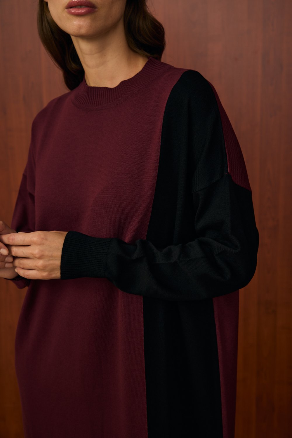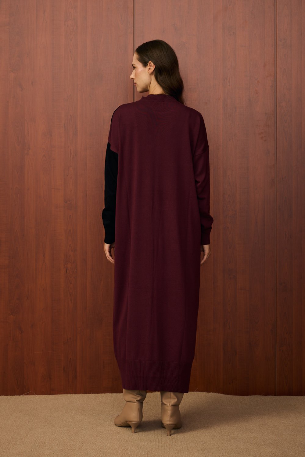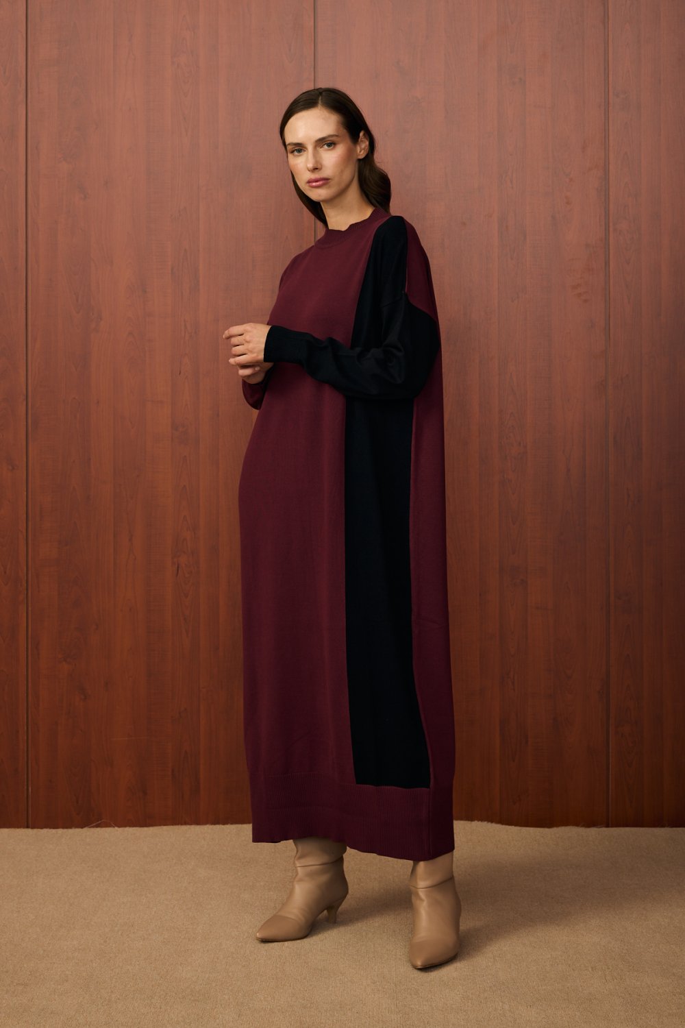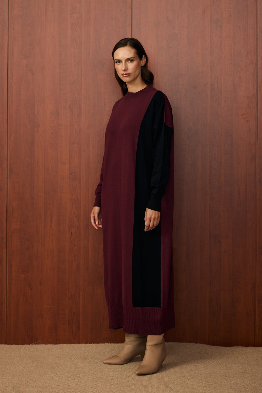 Renk bloklu tasarım (bordo-siyah)