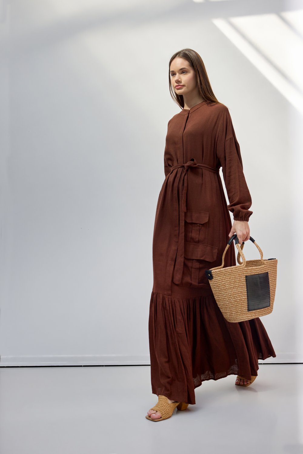 %100 pamuktan üretilen bu organik pamuk maxi elbise, hafif ve nefes alabilir yapısıyla konforlu bir kullanım sunar. Doğal tonlardaki zarif desenleri ve bel kısmındaki çıkarılabilir kemeri sayesinde hem rahat hem de şık bir görünüm elde edebilirsiniz. Günlük kullanımdan özel davetlere kadar her ortamda rahatlıkla tercih edilebilecek bu model, yumuşak dokusuyla cildinizde doğal bir his bırakır.