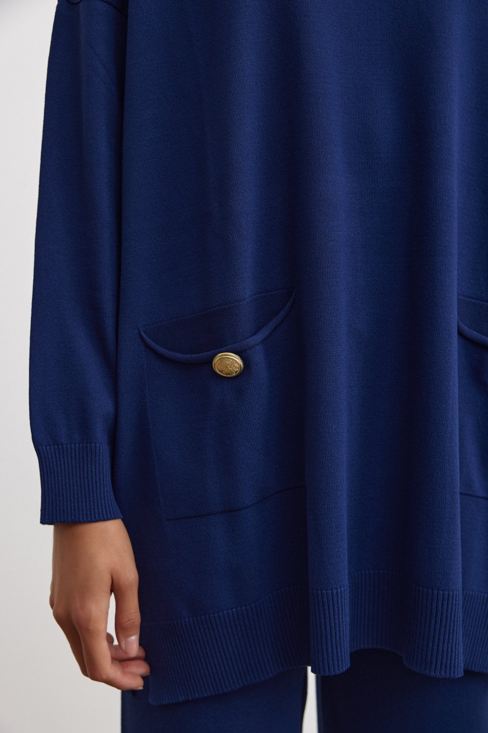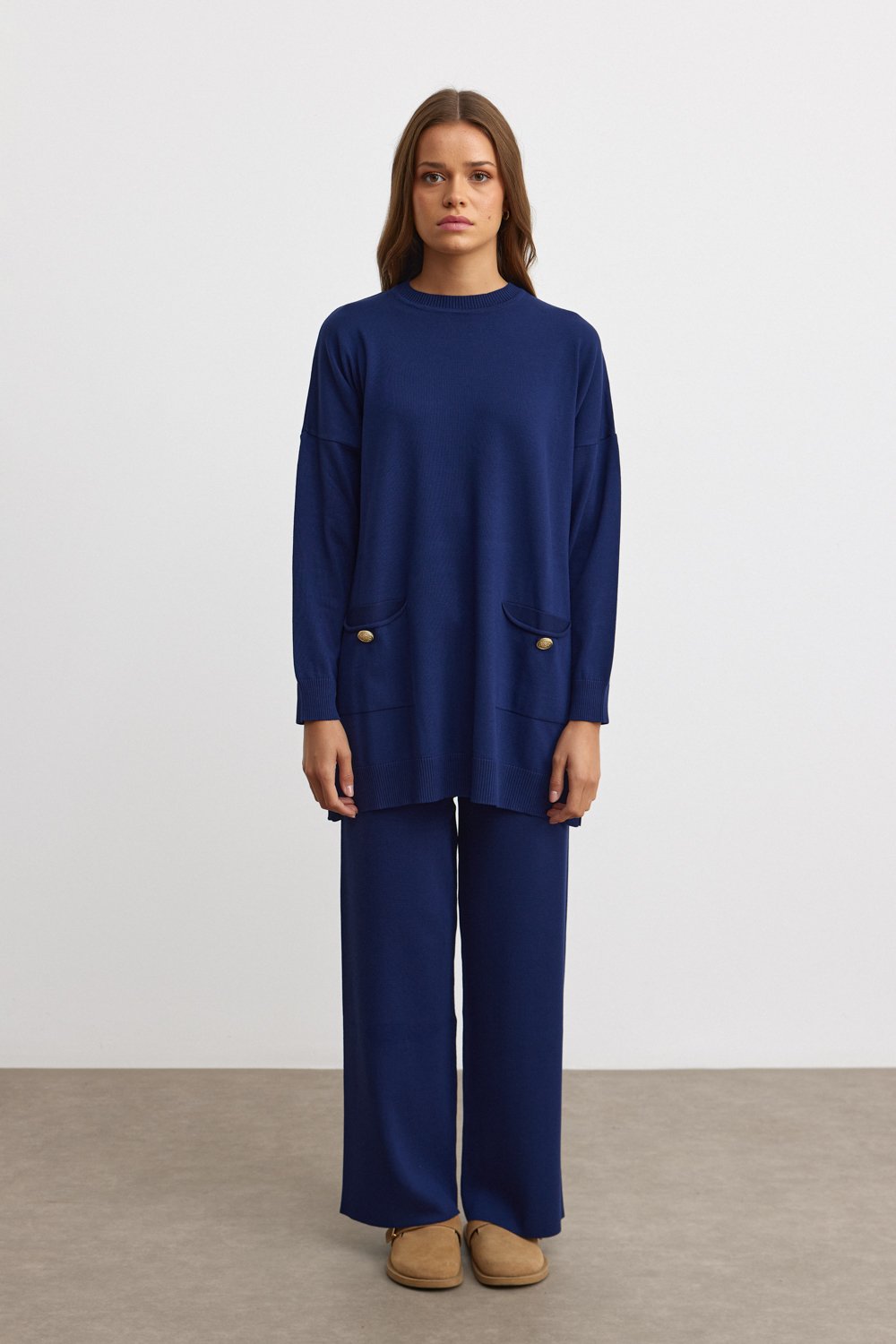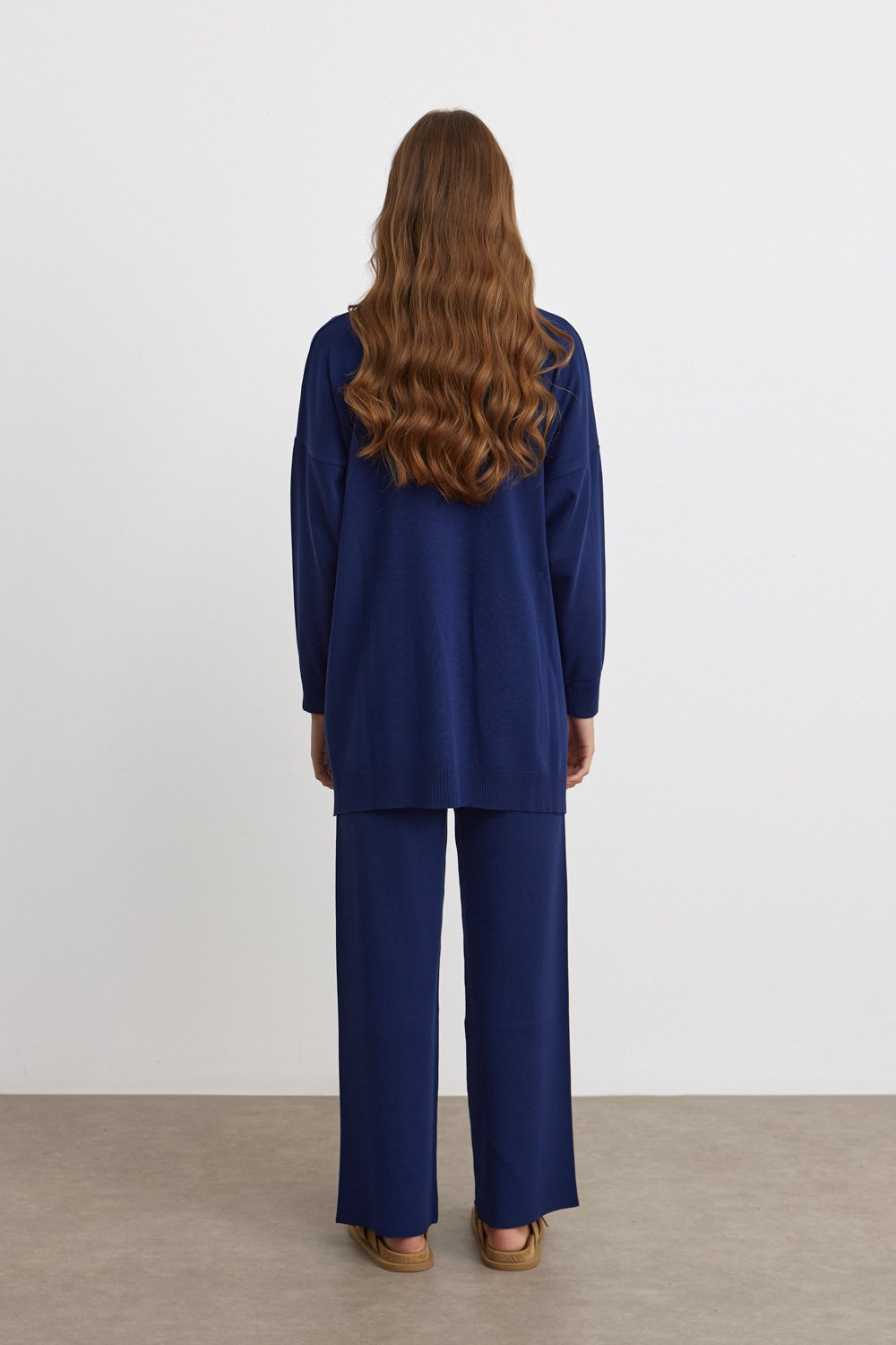 Ürün Açıklaması: Canlı  lacivert rengiyle  öne çıkan bu iki parçalı triko takım, hem rahat hem de şık bir görünüm sunar. Özel ipliklerden üretilmiş merserize pamuk ve viskon karışımı kumaşı sayesinde yumuşak ve nefes alabilir yapısıyla gün boyu konfor sağlar. Üst kısmı 75 cm uzunluğunda olup, salaş kesimi ile rahat bir stil sunarken, alt kısmı 95 cm uzunluğundadır. Bu takım, 36-44 beden aralığına uyumlu esnek yapısı sayesinde her bedene kolayca uyum sağlar.