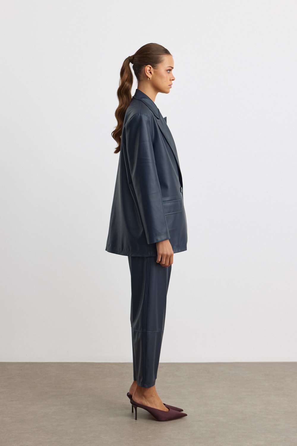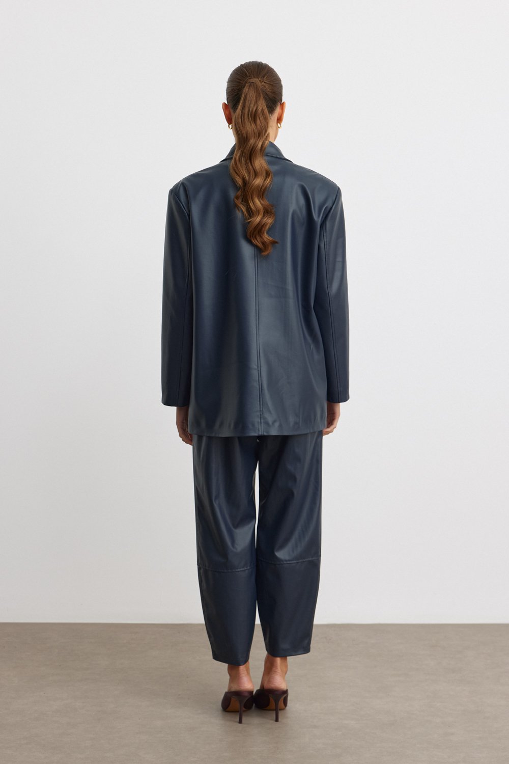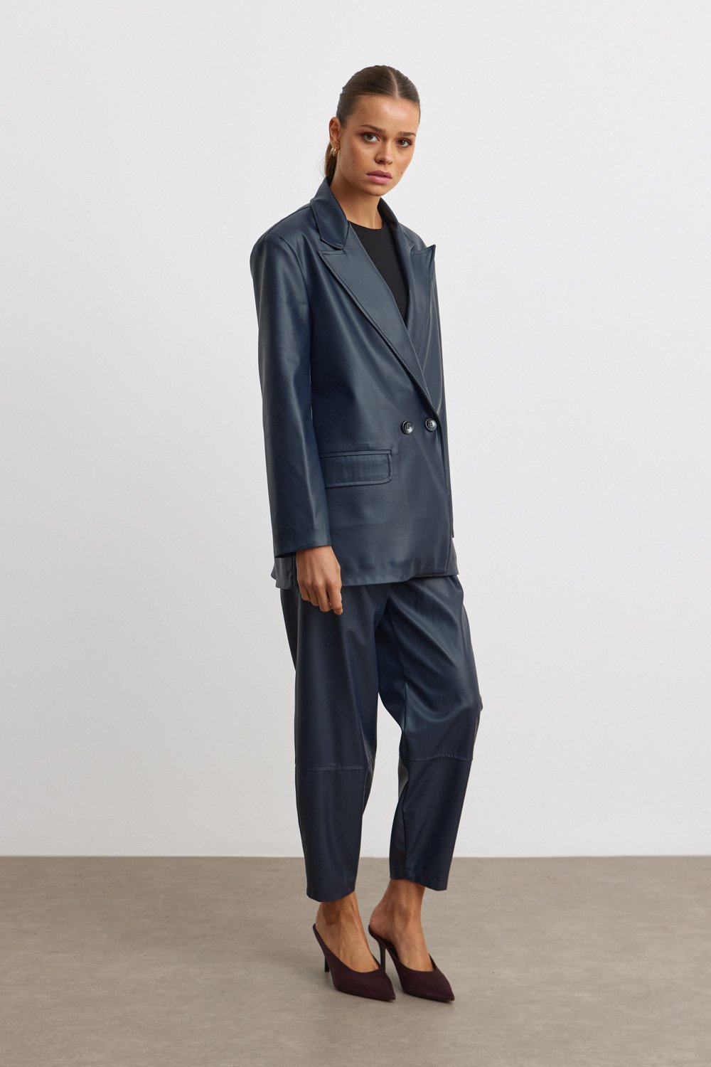 Kusursuz bir şıklık ve zarafetin temsilcisi olan bu lacivert suni deri blazer ceket, modern çizgisi ve rahat kesimiyle hem ofis hem de özel davetlerde stilinizi ön plana çıkaracak. Yüksek kaliteli suni deri kumaşı ile şıklığınızı tamamlayan bu parça, rahatlığıyla da öne çıkıyor. Mankenin üzerinde gördüğünüz bu model, bol kesimi ve kruvaze düğme detayı ile klasik bir görünüm sunarken aynı zamanda çağdaş bir hava katıyor. Sezonun en trend parçalarından biri olan bu blazer ceket, gardırobunuzun vazgeçilmezi olacak!
