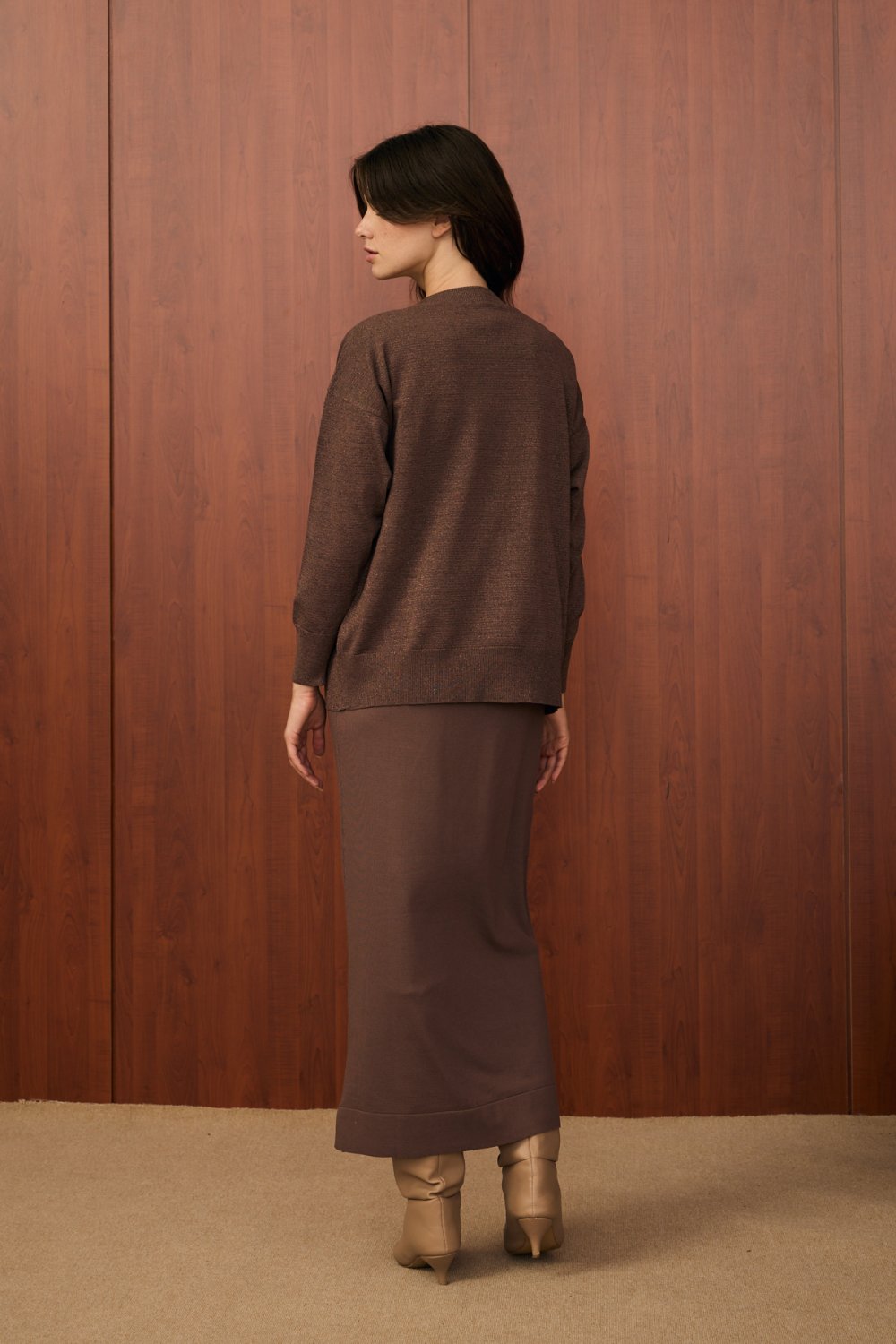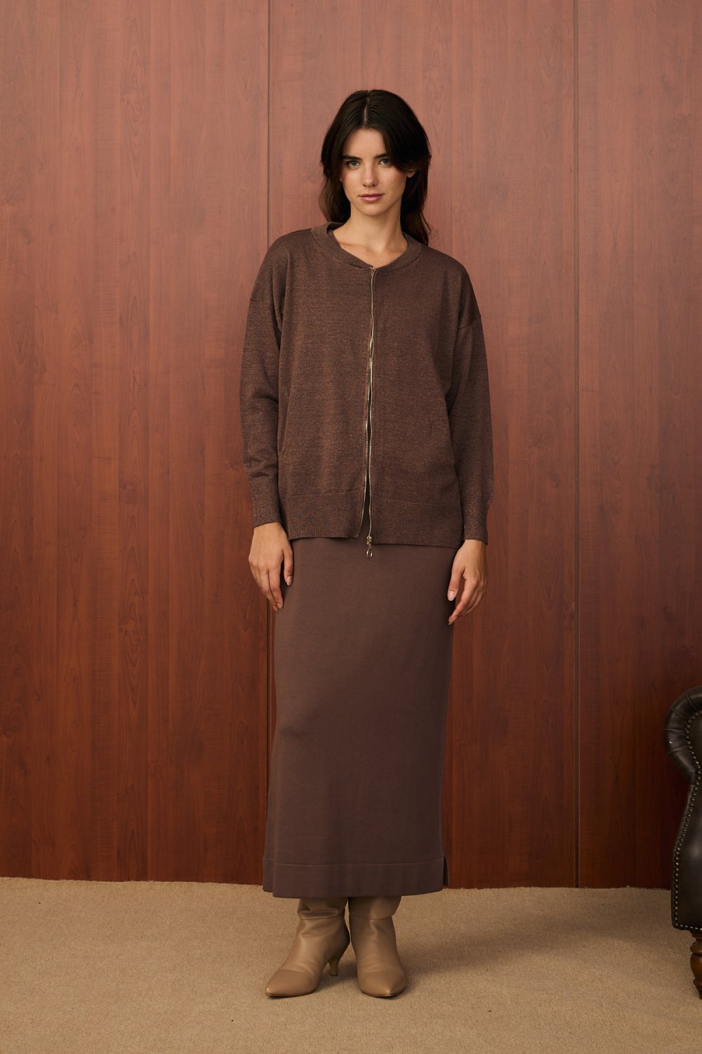 Simli yapısıyla zarafeti ön plana çıkaran bu takım, sade şıklık arayanlar için ideal bir seçenektir. Hafif parlak dokusu ve düz kesimiyle gündüzden geceye kullanım kolaylığı sunar. Ceket kısmında yer alan metalik fermuar detayları, modern bir dokunuş kazandırır.