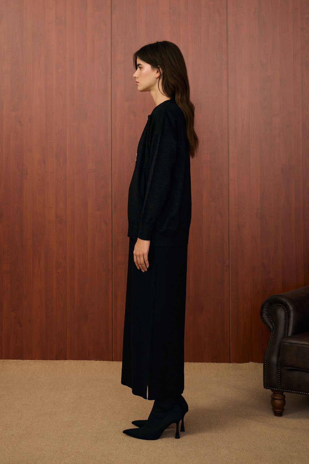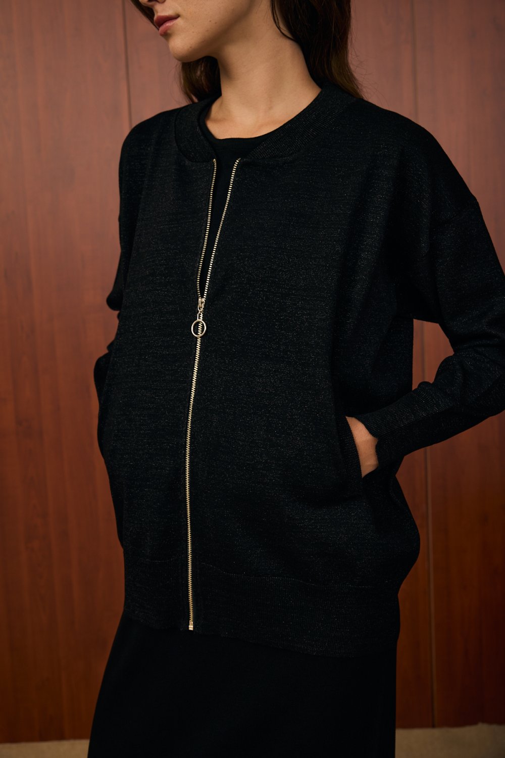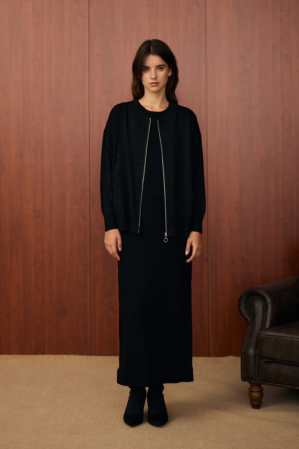 Simli yapısıyla zarafeti ön plana çıkaran bu takım, sade şıklık arayanlar için ideal bir seçenektir. Hafif parlak dokusu ve düz kesimiyle gündüzden geceye kullanım kolaylığı sunar. Ceket kısmında yer alan metalik fermuar detayları, modern bir dokunuş kazandırır.