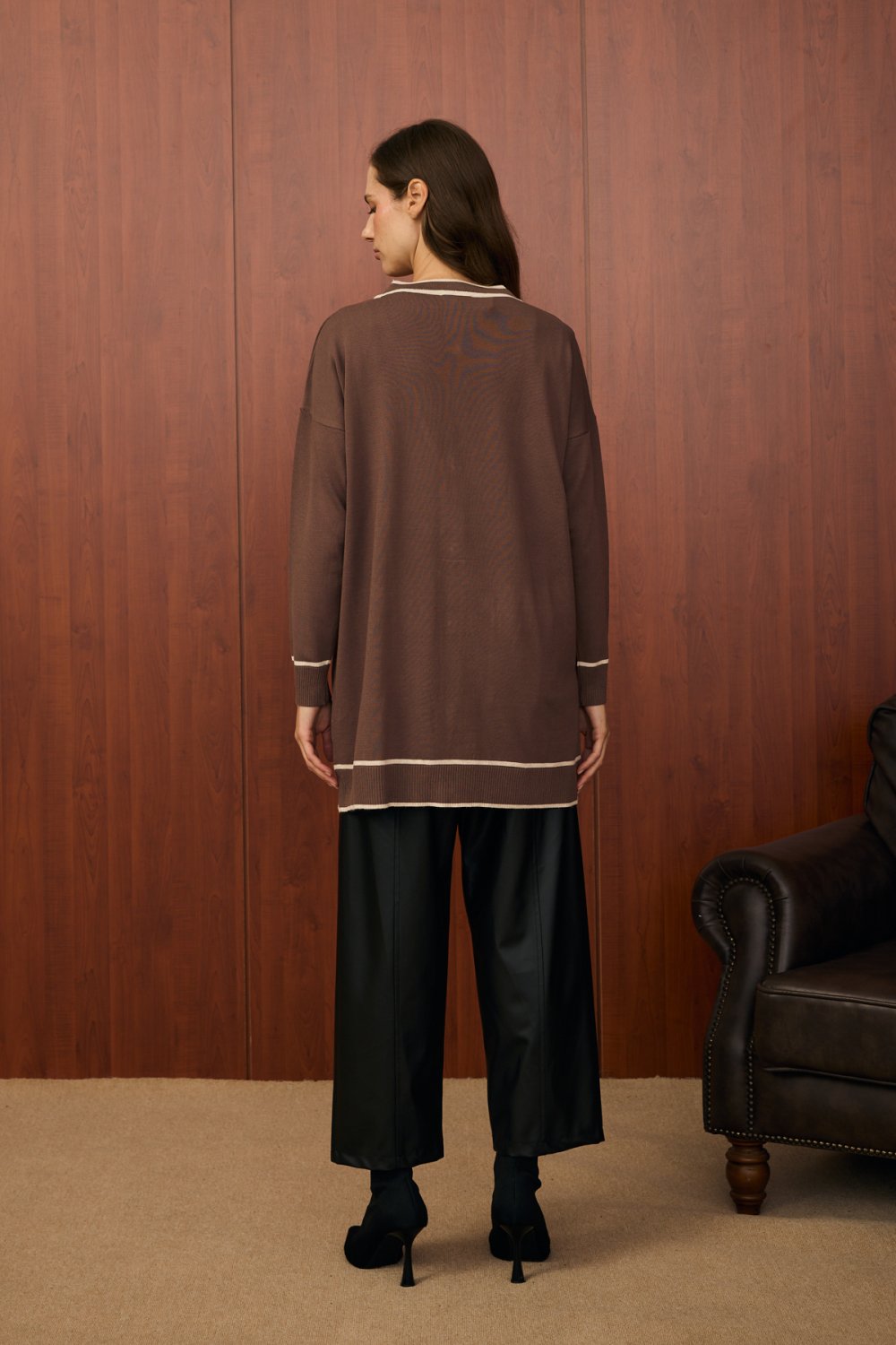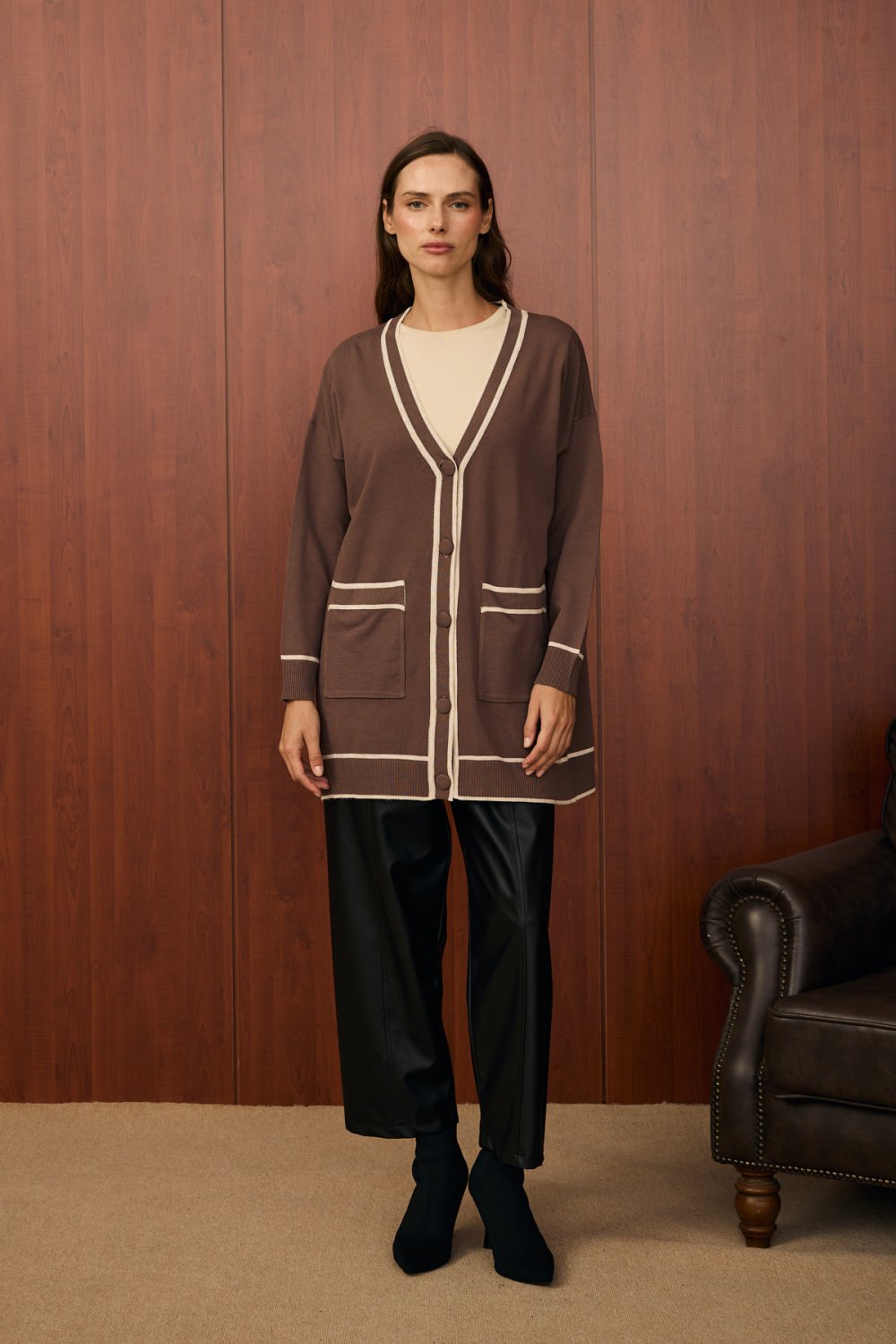 Kontrast renk biyeleriyle şıklık kazanan bu triko hırka, klasik ve zamansız bir görünüm sunar. Rahat kalıbı sayesinde gün boyu konfor sağlar. Ön kısmındaki düğme detayı ve iki cep uygulaması ile hem fonksiyonel hem de stil sahibidir. İnce triko yapısıyla mevsim geçişlerinde ideal bir tamamlayıcıdır.