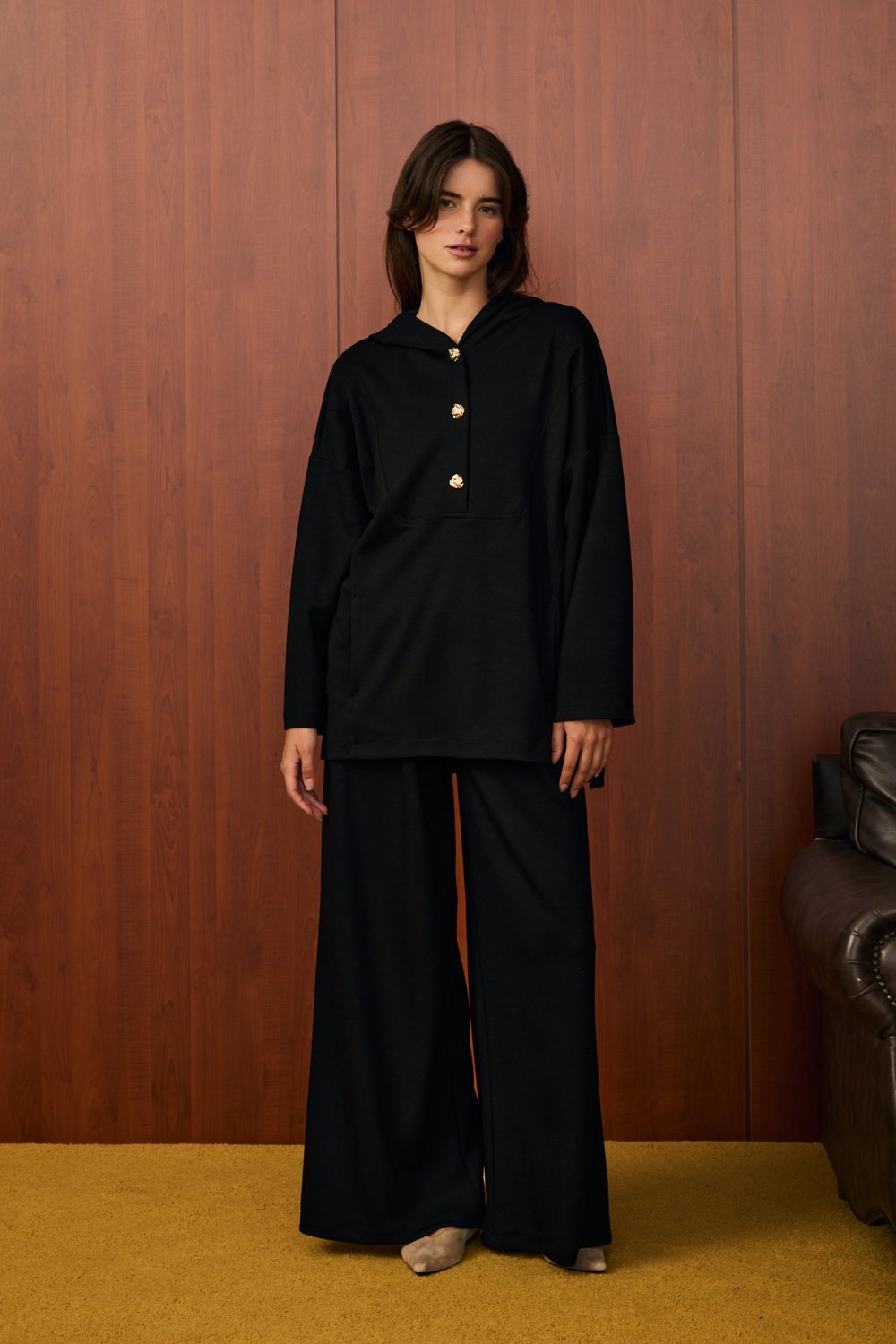 • Detaylar: Gold düğme detaylı kapüşonlu tunik, geniş paçalı pantolon