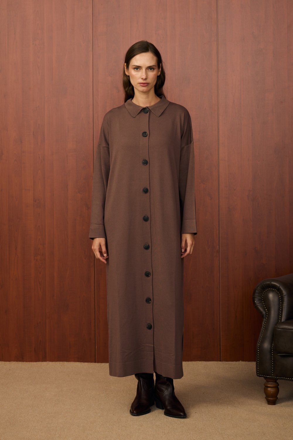 Önden tam boy düğmeli, yakalı ve sade tasarımıyla öne çıkan bu elbise, şıklık ve konforu bir arada sunar. Seyyar kuşağı sayesinde bele oturtularak daha vücuda göre bir silüet oluşturulabilir. Düz ve zarif formu ile günlük şıklık veya ofis stili için idealdir.