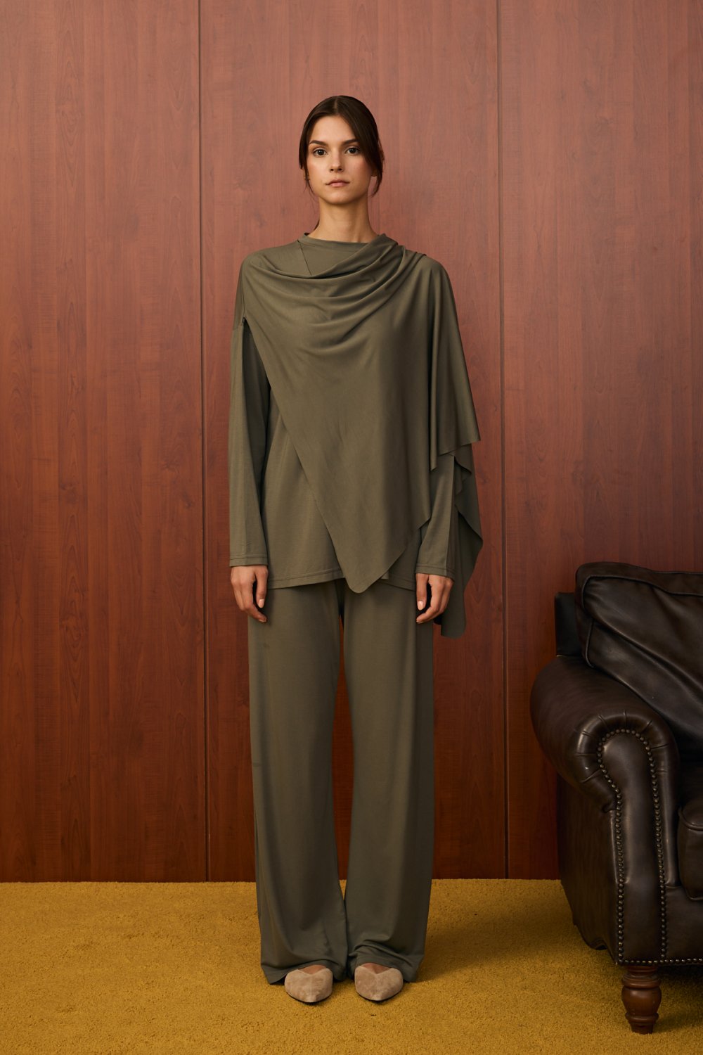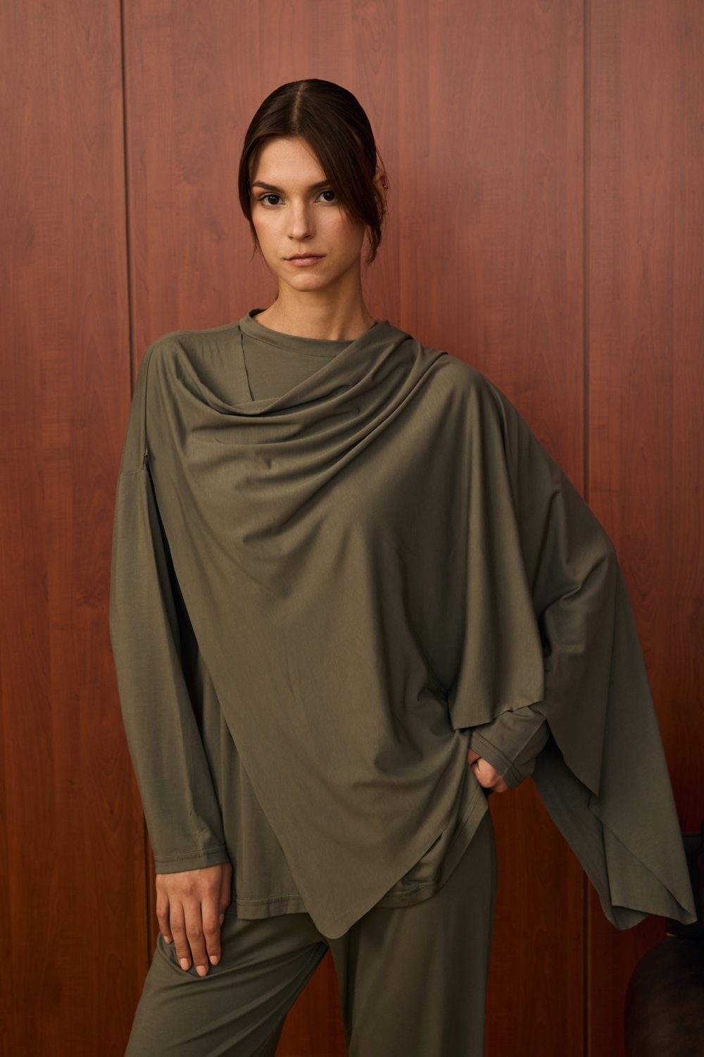 Ürünün yakasında, asimetrik bir şekilde omuzdan çapraz gelen ve ön kısımda drape oluşturan ekstra kumaş parçası yer almaktadır. Bu parça, göğüs üstüne çapraz şekilde serbestçe bırakılarak modern ve zarif bir hava katmaktadır. . Bu detay ürünün hem şıklığını artırır hem de sade tasarımı hareketlendirir.
