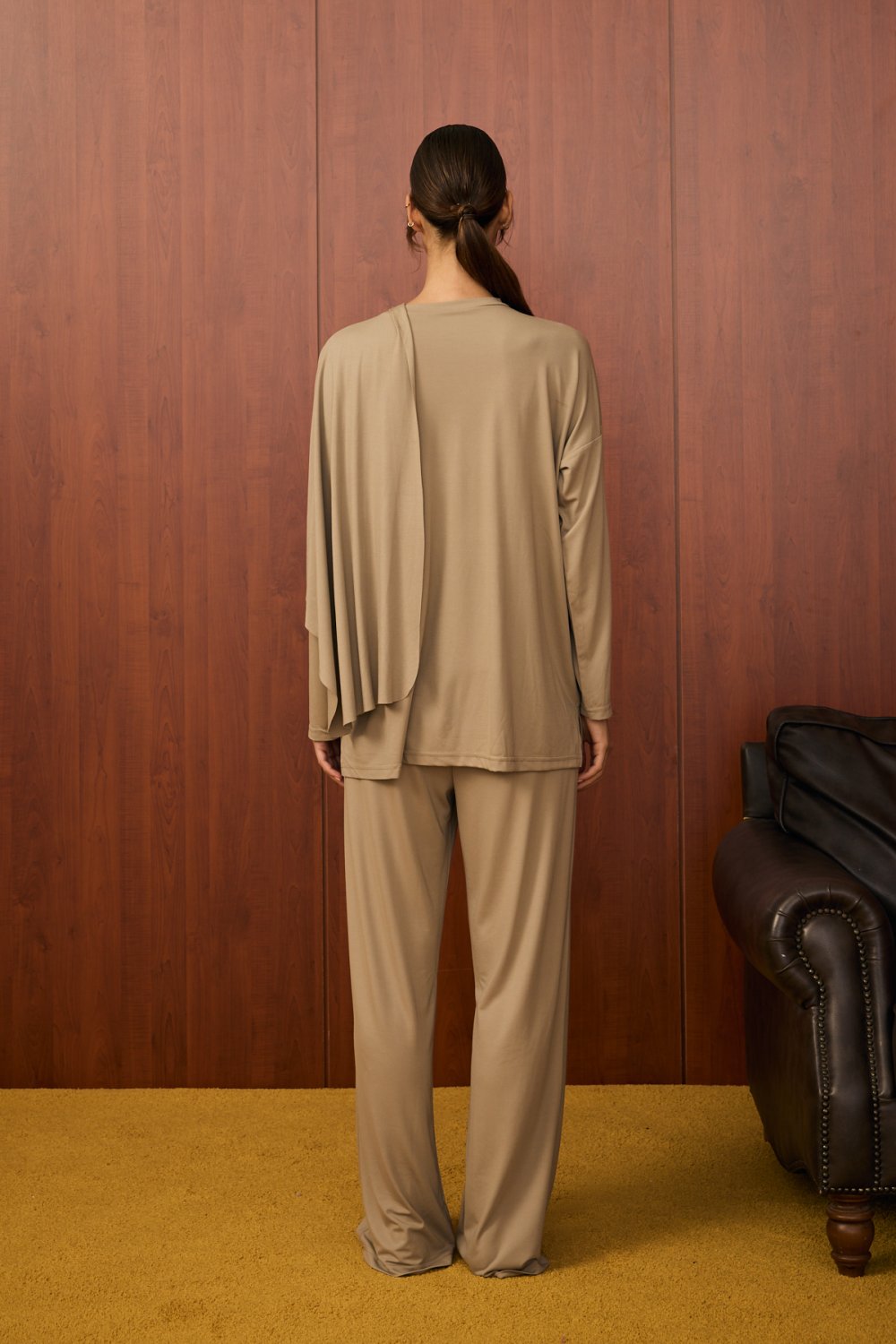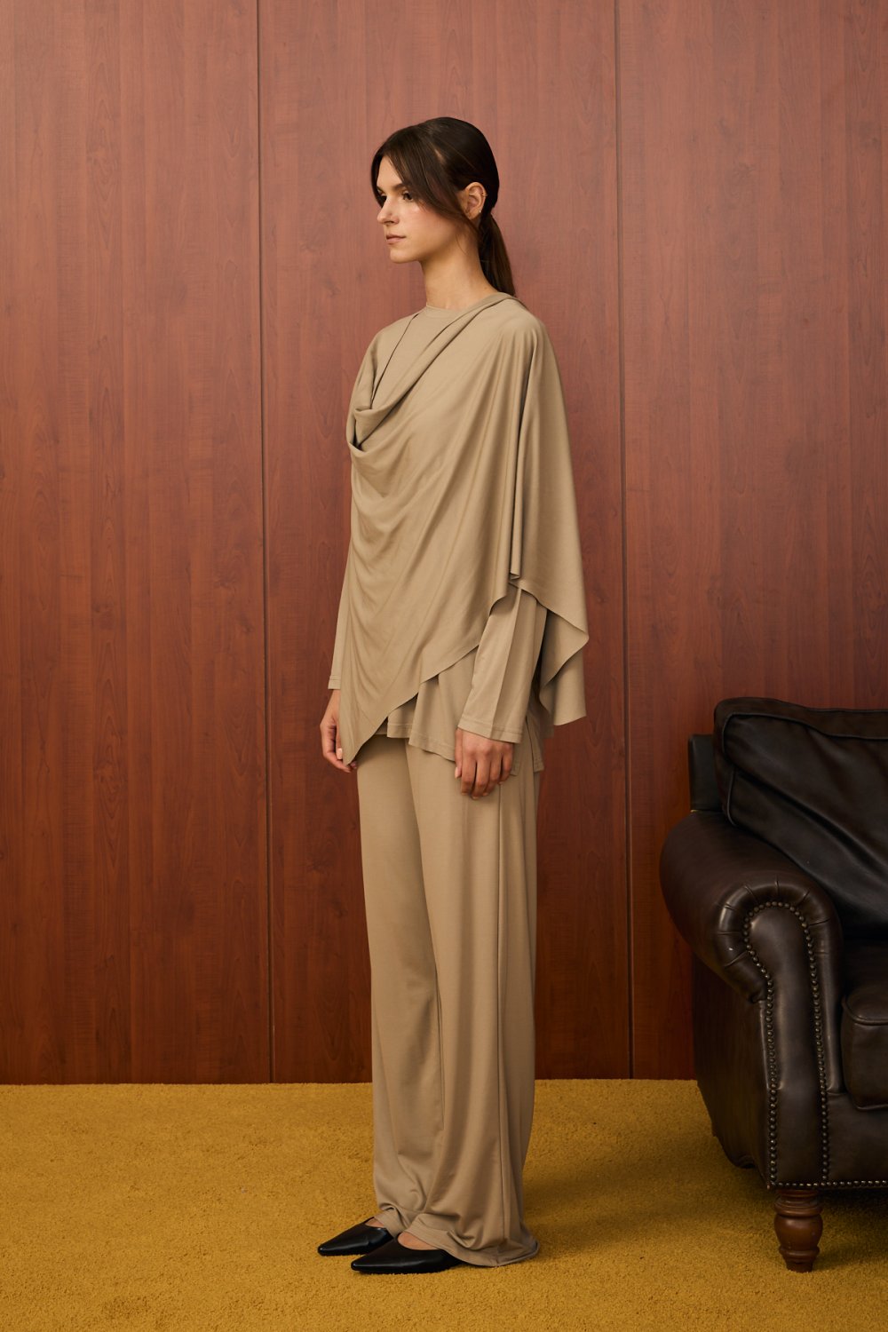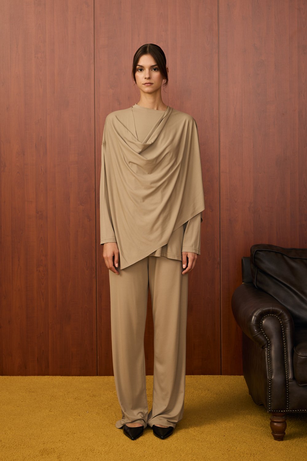 Ürünün yakasında, asimetrik bir şekilde omuzdan çapraz gelen ve ön kısımda drape oluşturan ekstra kumaş parçası yer almaktadır. Bu parça, göğüs üstüne çapraz şekilde serbestçe bırakılarak modern ve zarif bir hava katmaktadır. . Bu detay ürünün hem şıklığını artırır hem de sade tasarımı hareketlendirir.
