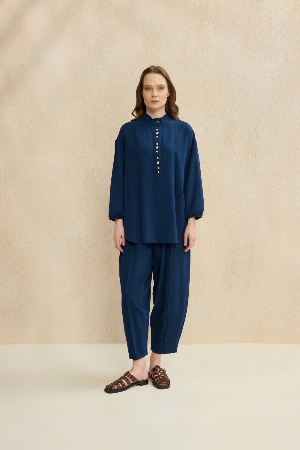 ✔ Detaylar: Ön kısmında inci görünümlü düğmeler, lastikli bilek detaylı tunik, dökümlü pantolon.