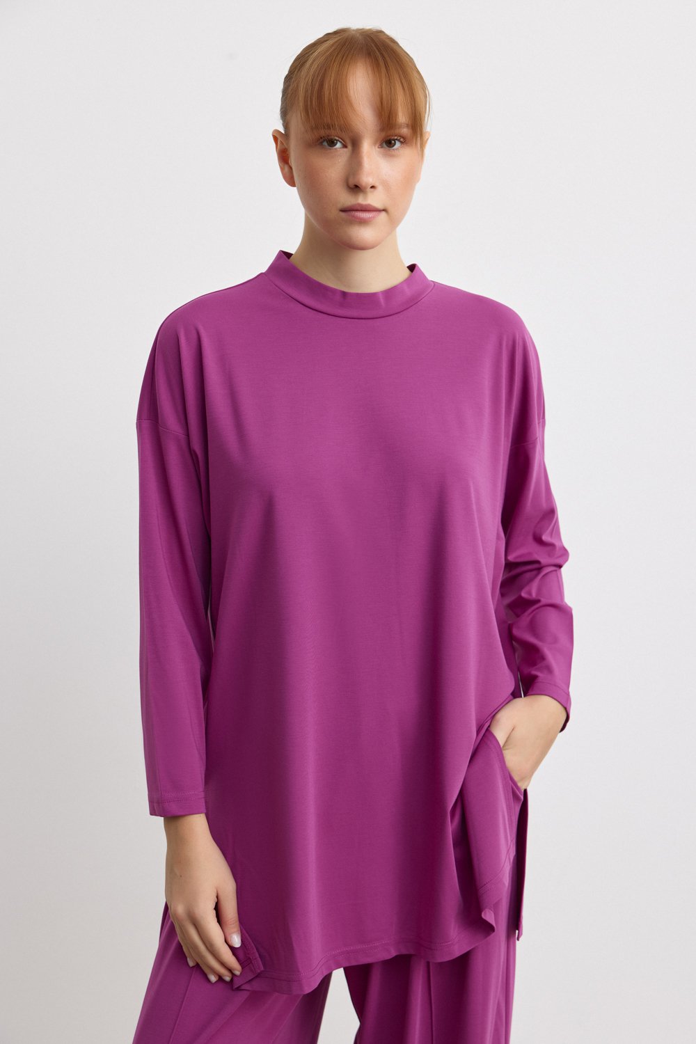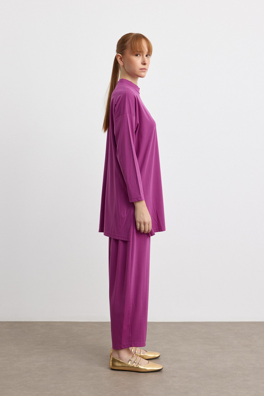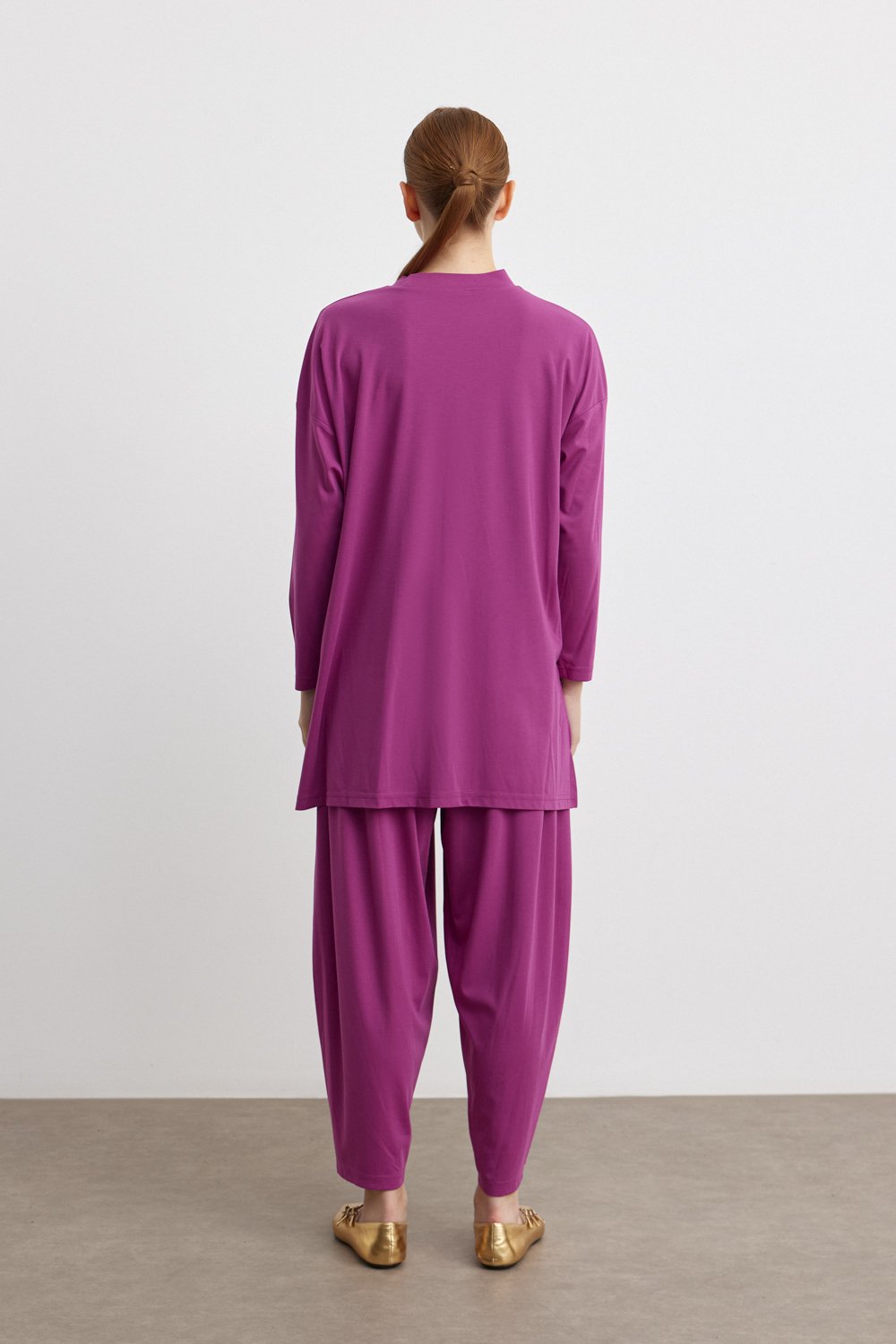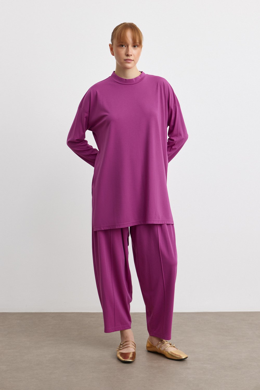 Ürün Açıklaması: Bu rahat ve modern ikili takım, yumuşak modal kumaşı ile gün boyu konfor sağlar. Oversize kesim uzun üst (82 cm boy) ve rahat kesim pantolon (95 cm boy) ile minimal ve şık bir görünüm sunar. Mankenin boyu 173 cm olup, üzerindeki beden 1 bedendir. Bu takım, rahatlığı ve tarzı bir arada arayanlar için mükemmel bir seçimdir.