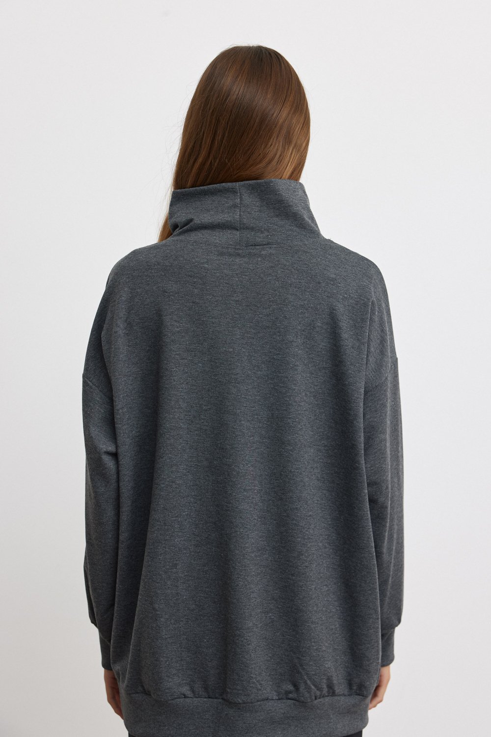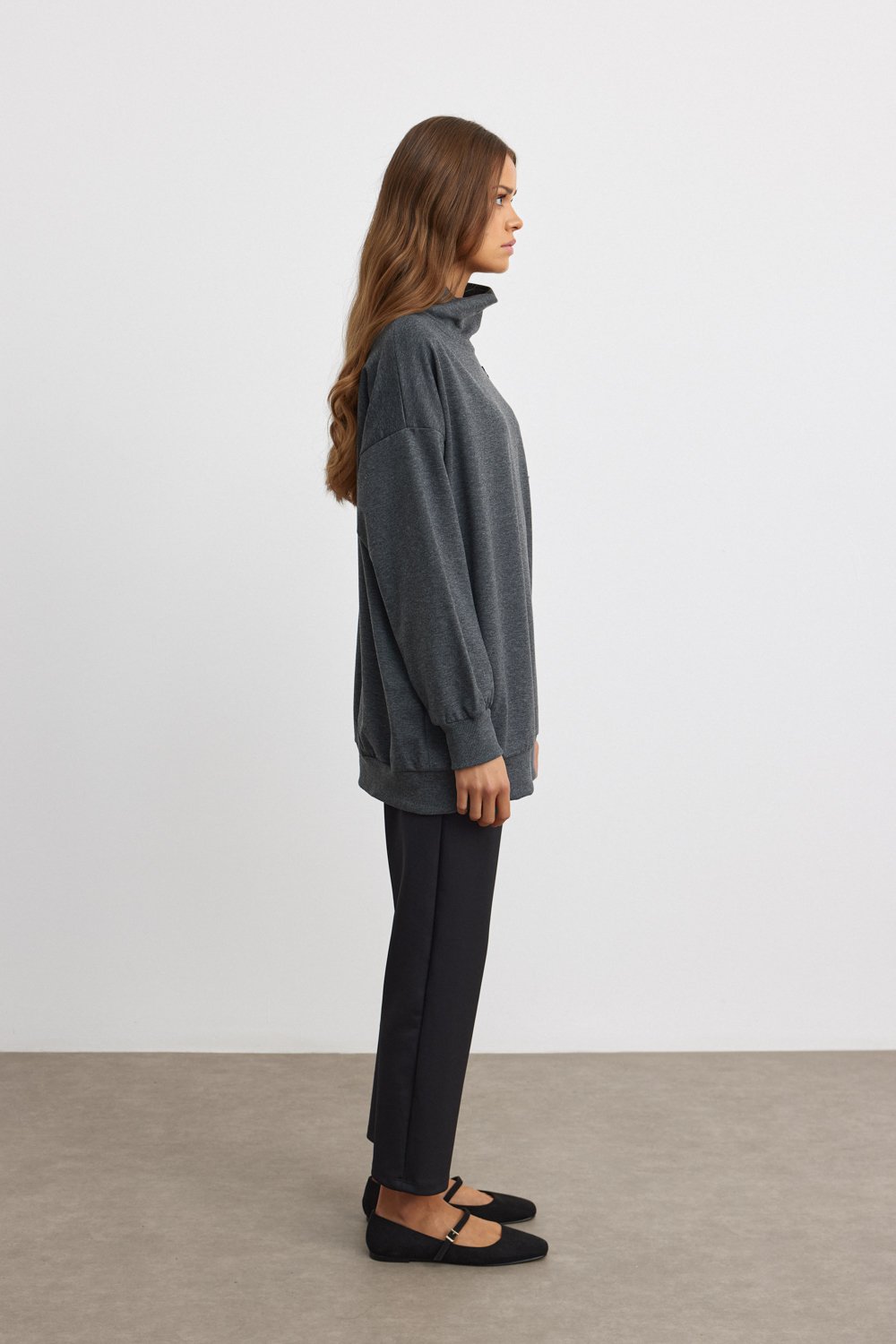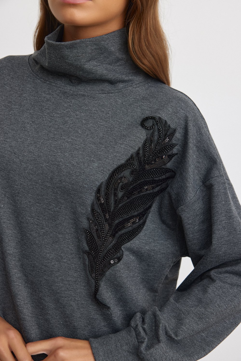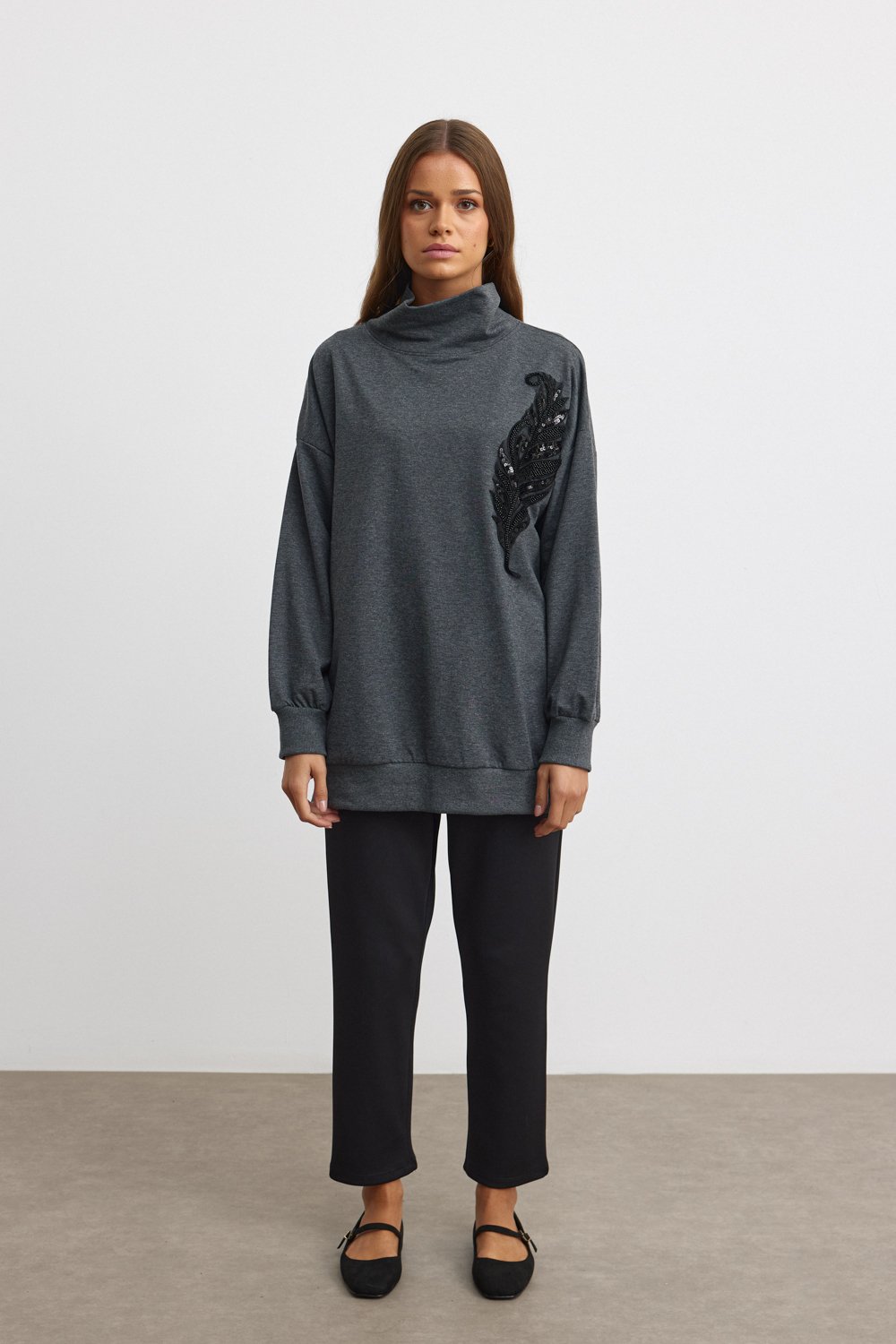 Ürün Açıklaması: Bu zarif antrasit boğazlı sweatshirt, üzerinde yer alan detaylı nakış işleme ile şıklığı ve konforu bir arada sunuyor. İki iplik kumaştan üretilmiş bu sweatshirt, 73 cm uzunluğunda olup, yumuşak dokusu ve rahat kesimiyle günlük giyim için idealdir. Sweatshirt ün sade tasarımı, göğüs kısmındaki zarif nakış detaylarıyla hareketlendirilmiştir. Siyah pantolon ile mükemmel uyum sağlayarak, şık ve modern bir görünüm yaratır.