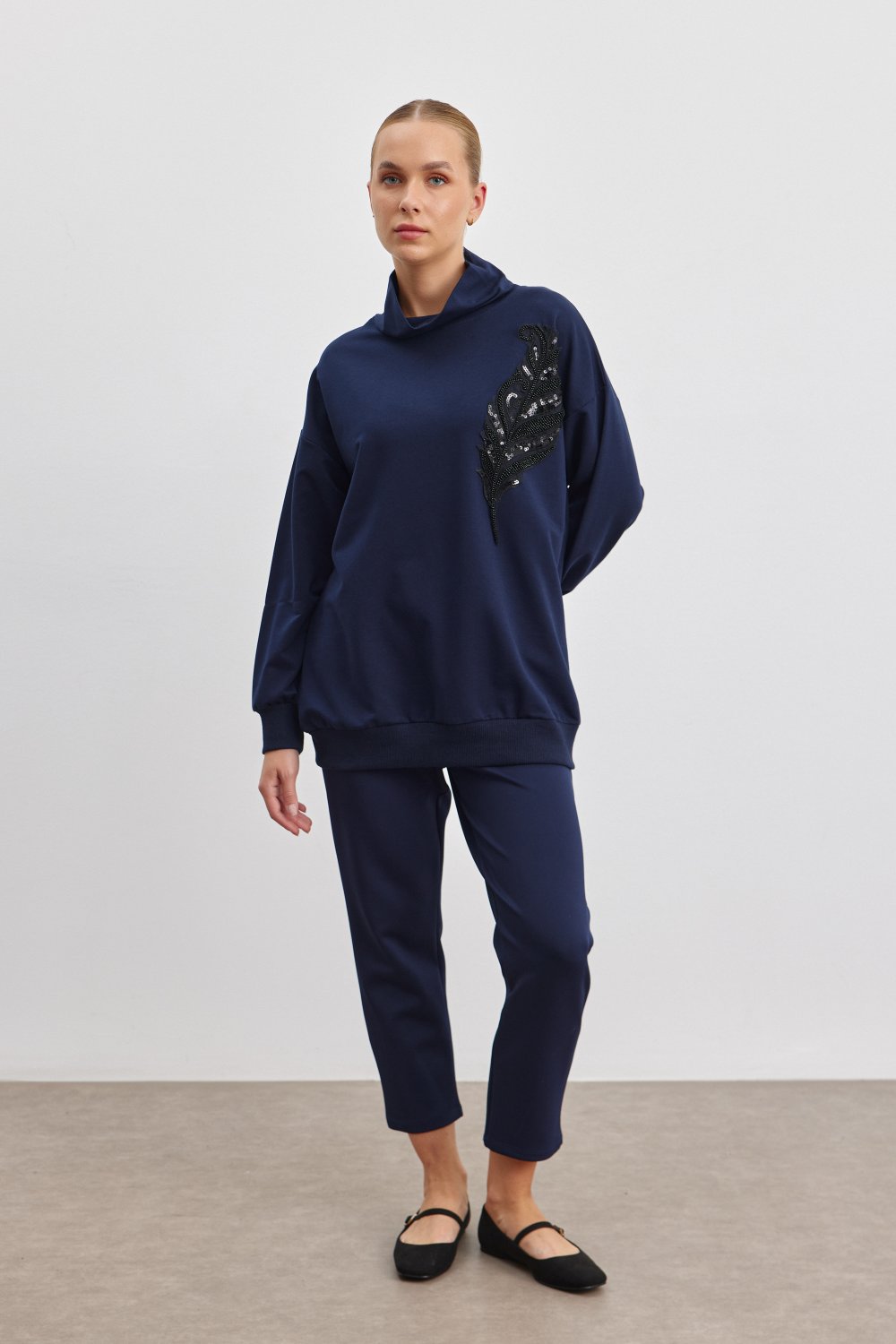 Neden Bu Ürünü Almalısınız? Bu siyah nakışlı sweatshirt ve siyah pantolon takımı, hem şıklığı hem de rahatlığı bir arada arayanlar için mükemmel bir seçimdir. İki iplik kumaşın sunduğu konfor ile birlikte, nakış detayları sayesinde günlük giyiminize zarafet katabilirsiniz. Kolayca kombinlenebilir ve her mevsimde giyilebilecek bu set, gardırobunuzun vazgeçilmez bir parçası olacak!