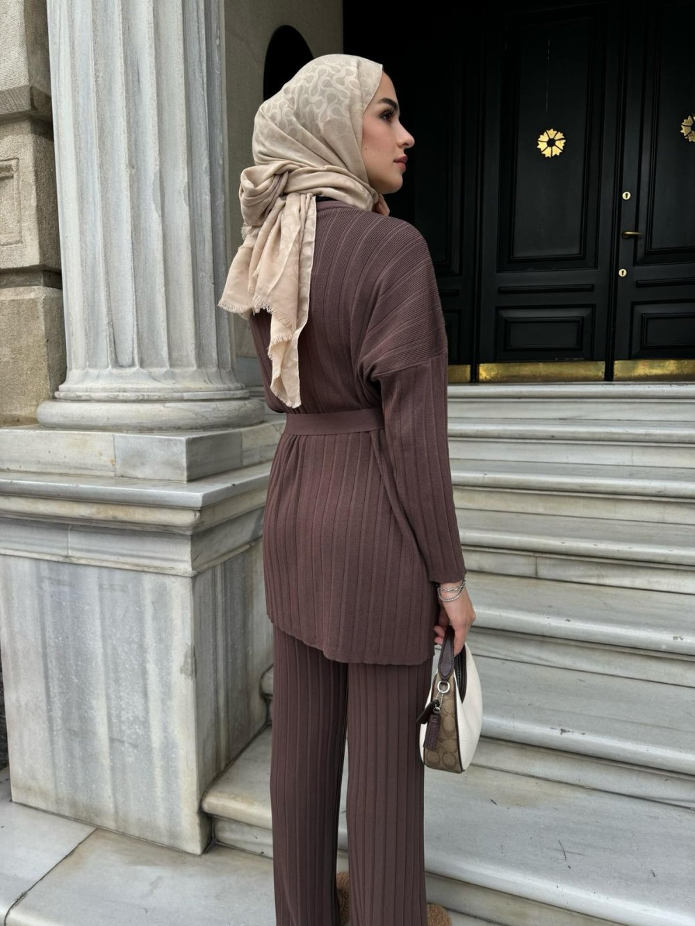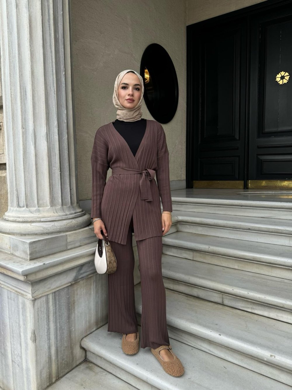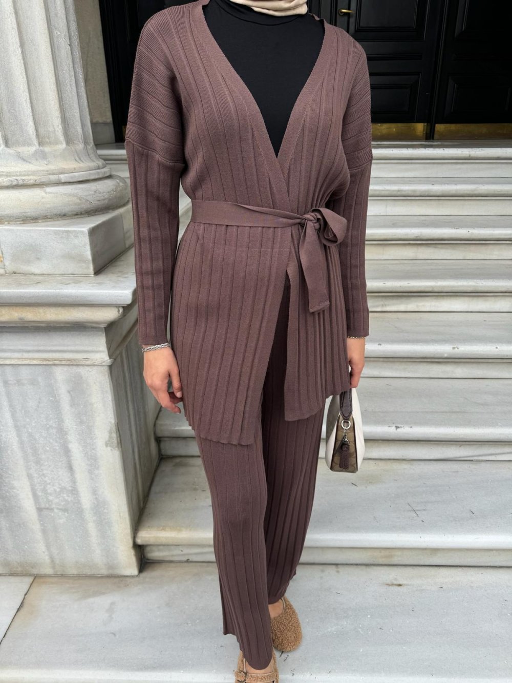 Gardırobunuza modern bir dokunuş katacak bu kuşaklı hırka takım ile her daim şık ve rahat hissedeceksiniz!