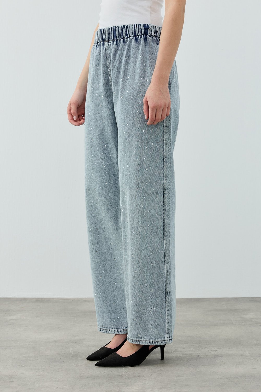 Palazzo Taşlı Denim Pantolon-Ky Mavi