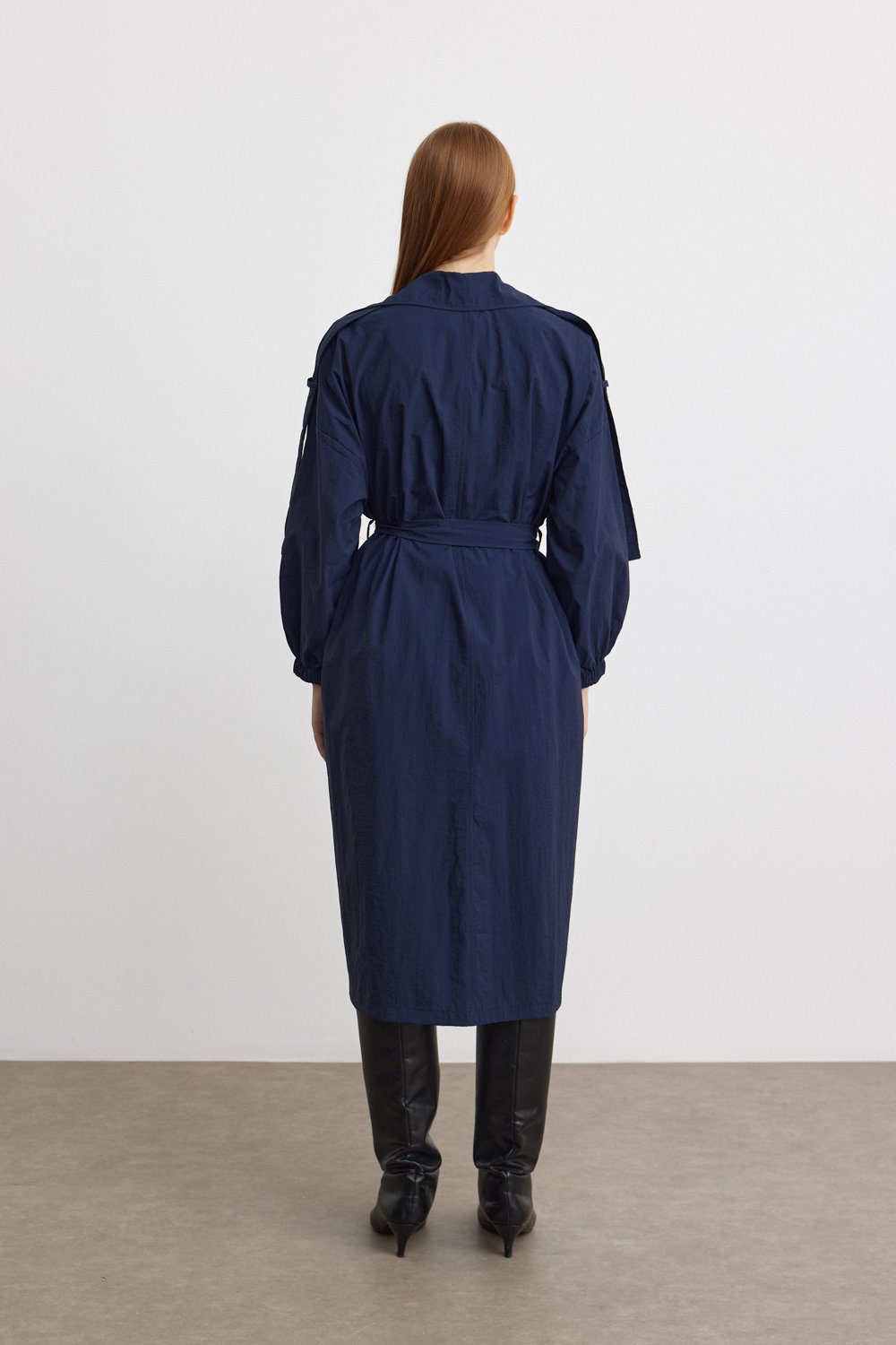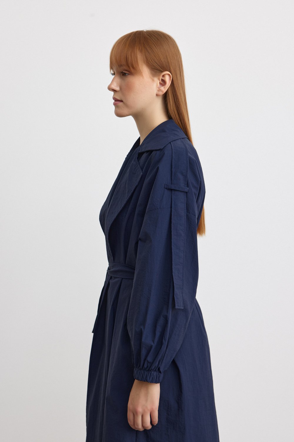 Ürün Detayı: Bu hafif ve şık lacivert renkli paraşüt kumaş trençkot, hem şıklığı hem de konforu bir araya getirerek modern bir dış giyim parçası olarak öne çıkıyor. 114 cm uzunluğu ile diz hizasında biten bu trençkot, rüzgârlı ve yağmurlu havalarda ideal bir koruma sağlar. Hafif yapısı ile rahat hareket imkanı sunar ve her mevsim kullanılabilir.