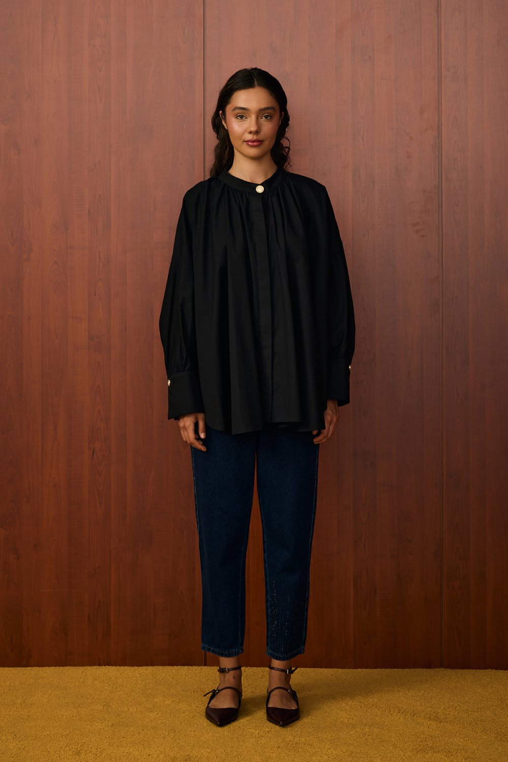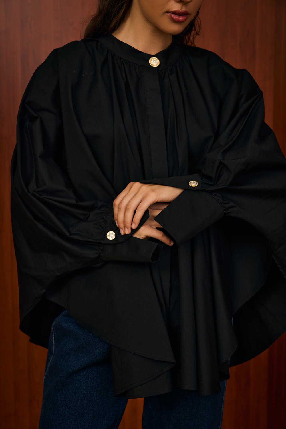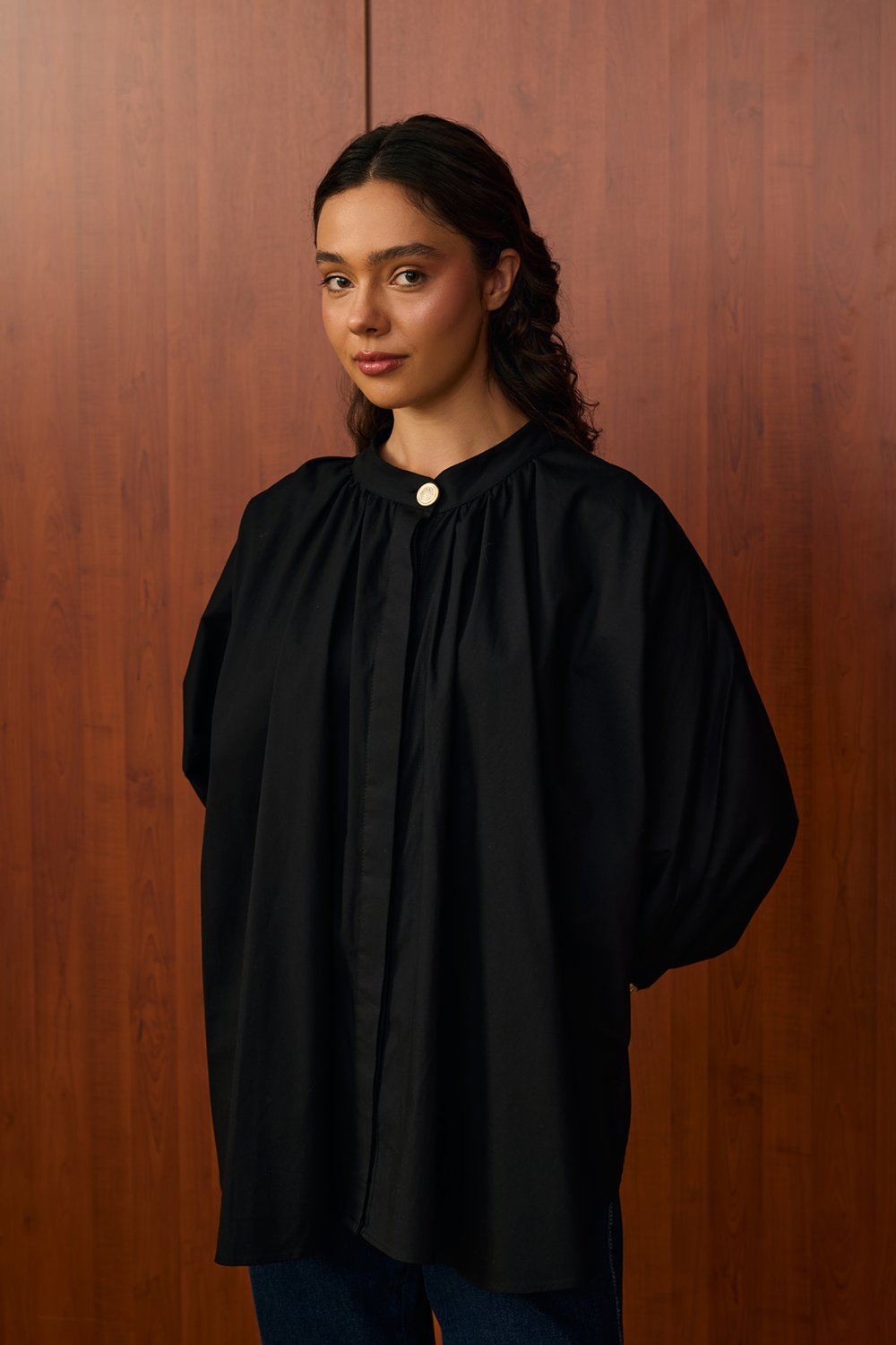 • Model Detayı: Yuvarlak yaka, önü plise detaylı, oversize kesim, uzun kollu gömlek. Manşet ve yaka kısmındaki düğme detayları şık bir görünüm kazandırır.