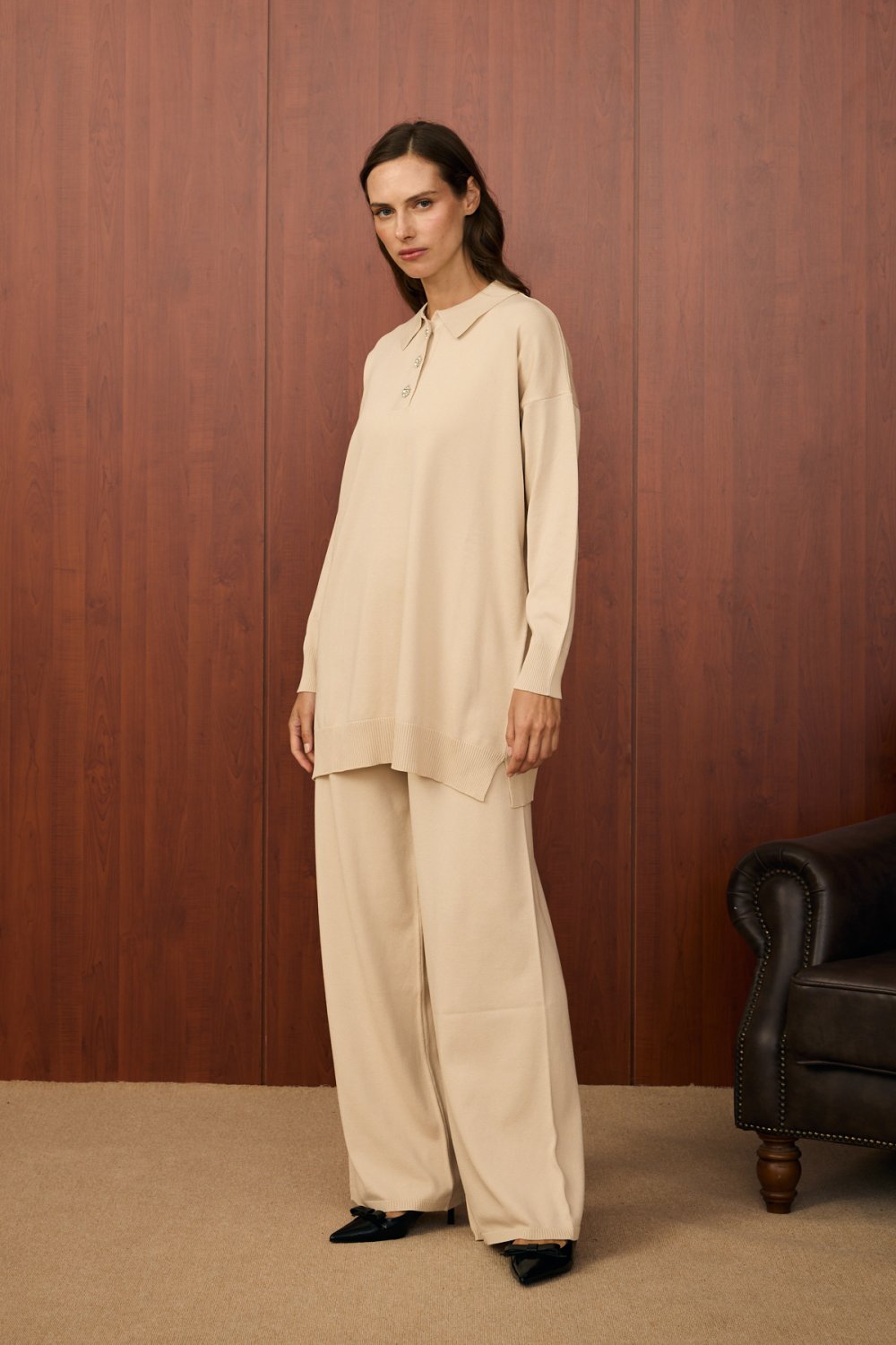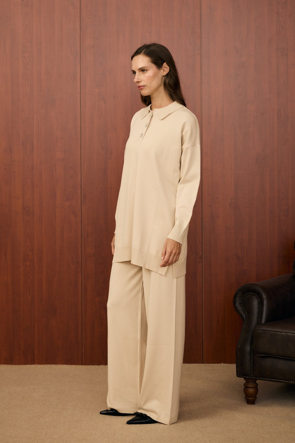 Takım formundaki bu zarif ve sade tasarım, konforlu ve dökümlü yapısıyla günlük şıklığa hitap ediyor. Üst parça yakalı ve inci görünümlü düğmelerle detaylandırılmış olup 85 cm uzunluğundadır. Alt parça ise geniş paça kesimiyle rahat bir duruş sunar ve 105 cm boyundadır. Yumuşak ve nefes alabilen viskon-pamuk karışımlı kumaşı sayesinde dört mevsim rahatlıkla kullanılabilir.