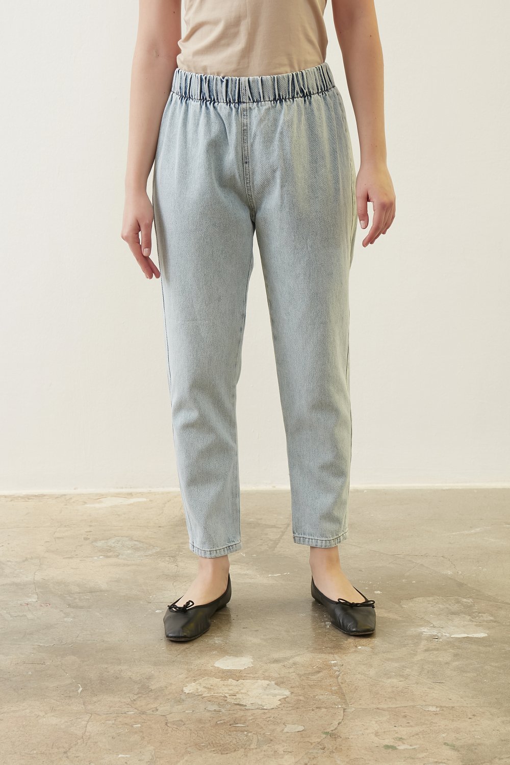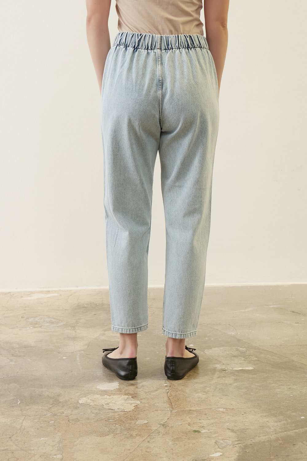 Beli Lastikli Düğme Detaylı Denim Pantolon