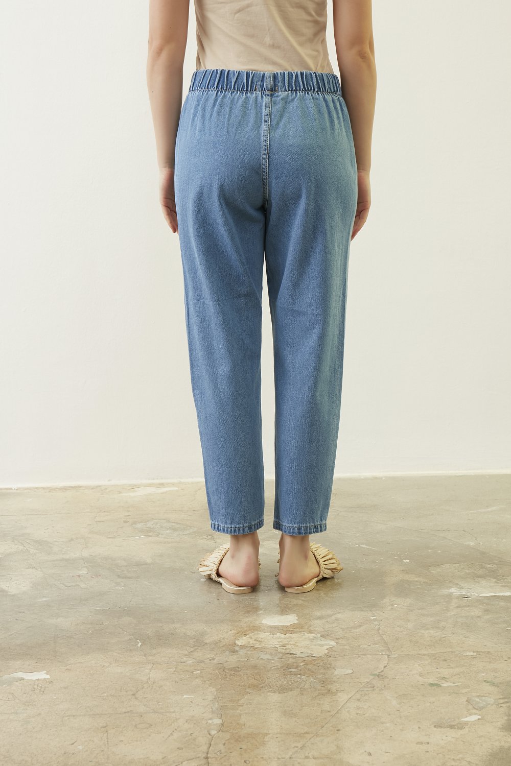 Beli Lastikli Düğme Detaylı Denim Pantolon
