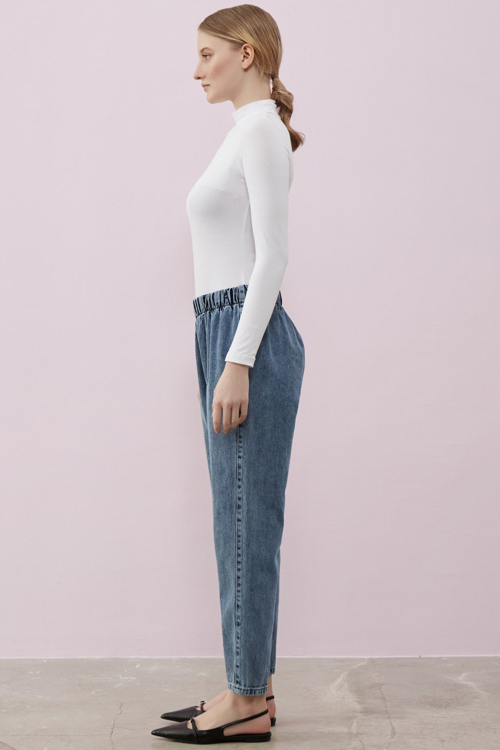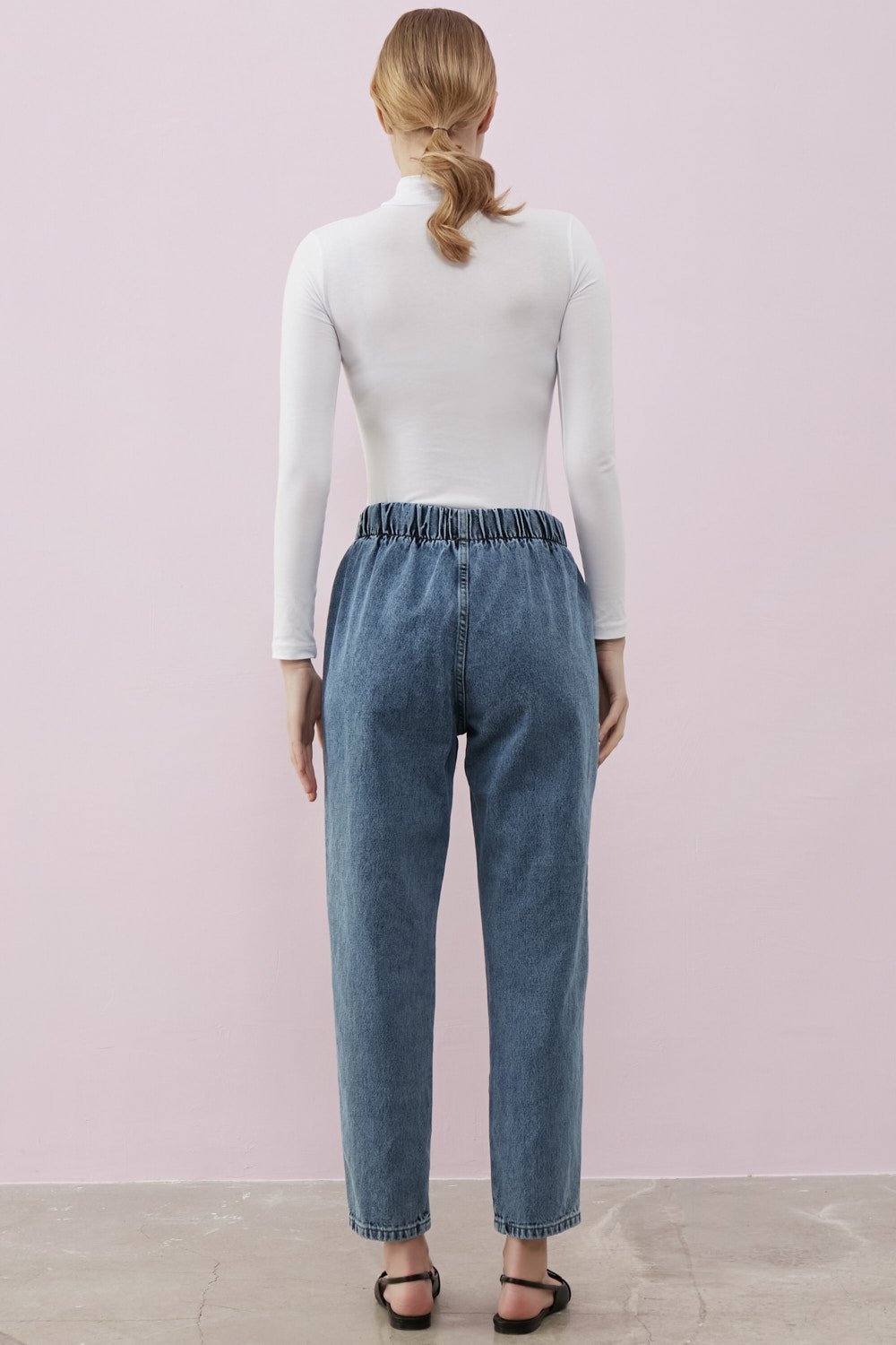 Beli Lastikli Düğme Detaylı Denim Pantolon