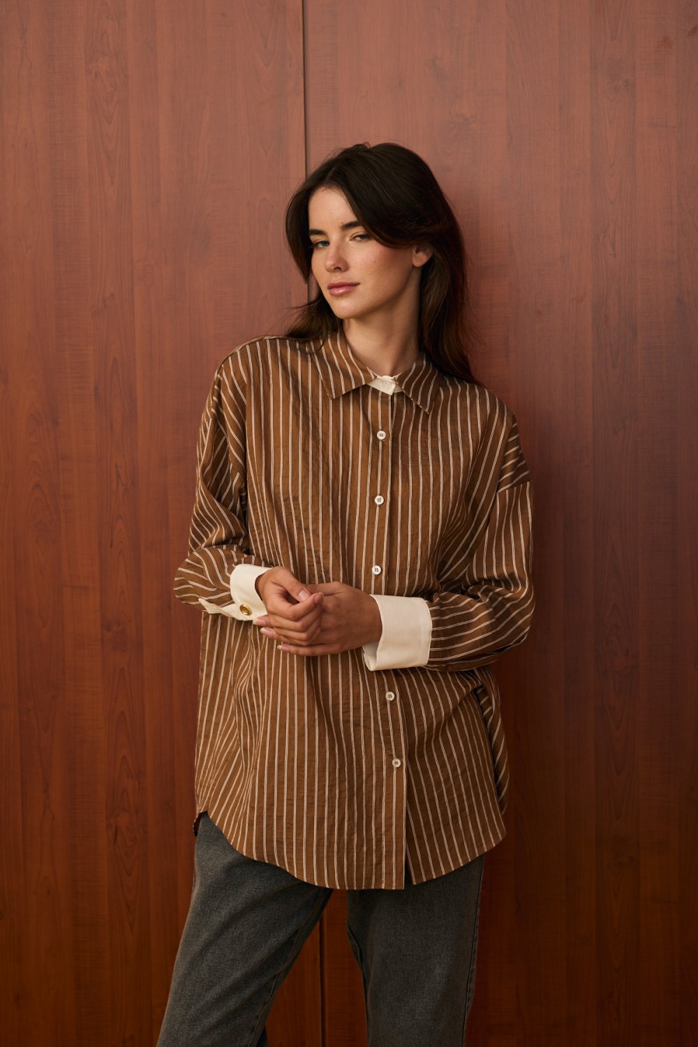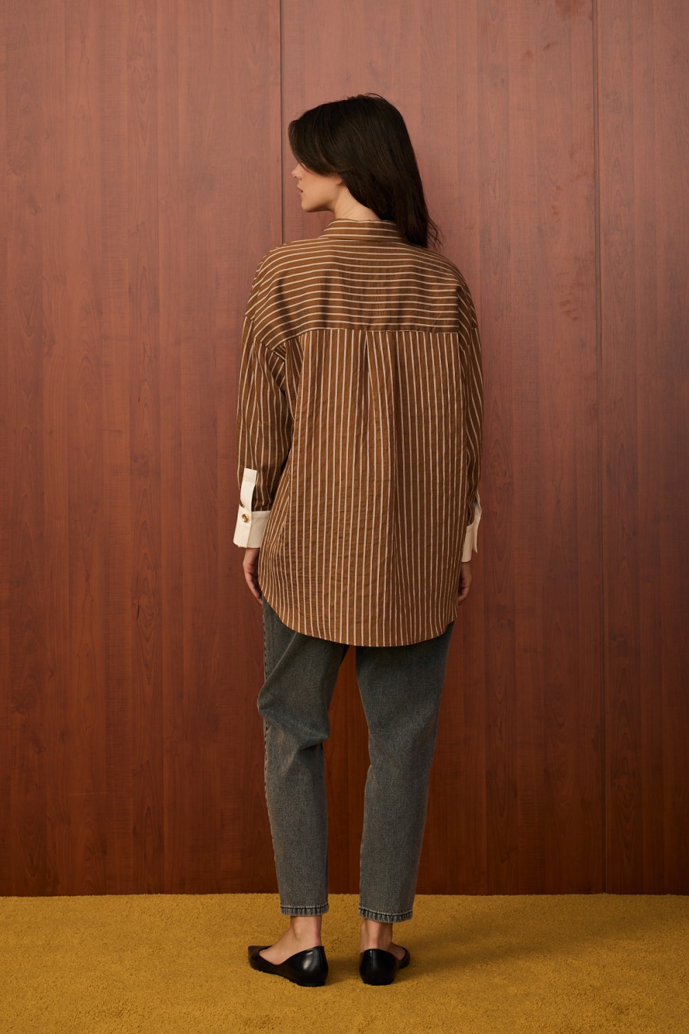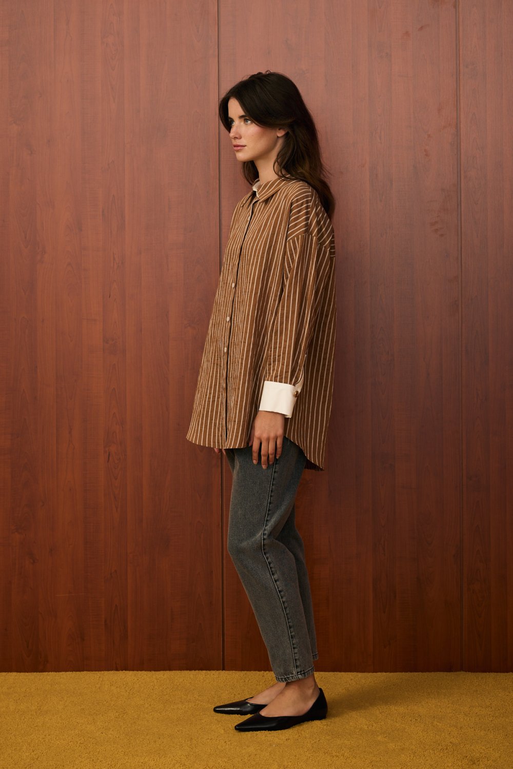 • Model Detayı: Çizgili, oversize kesim, uzun kollu gömlek. Düğmeli tasarımı ve kontrast manşet detayı ile modern bir görünüm sunar.