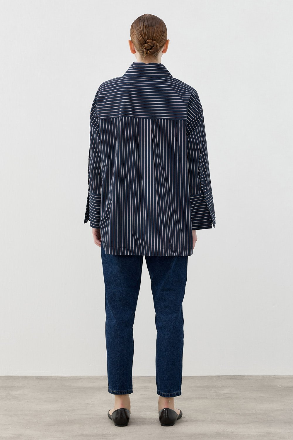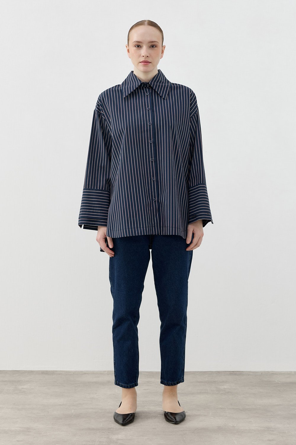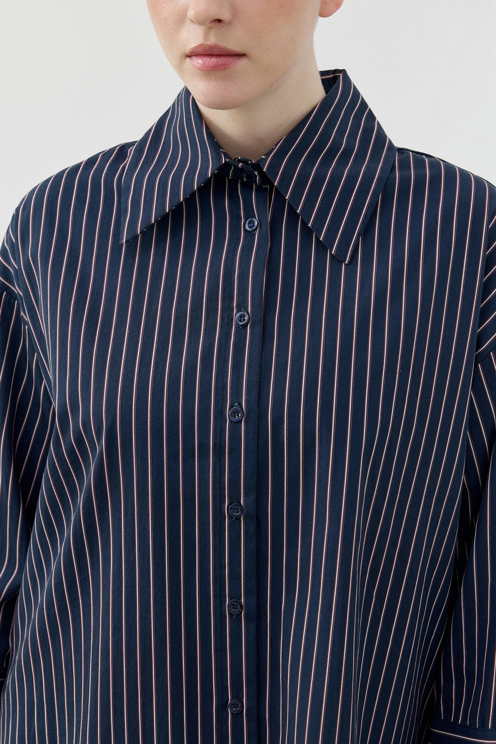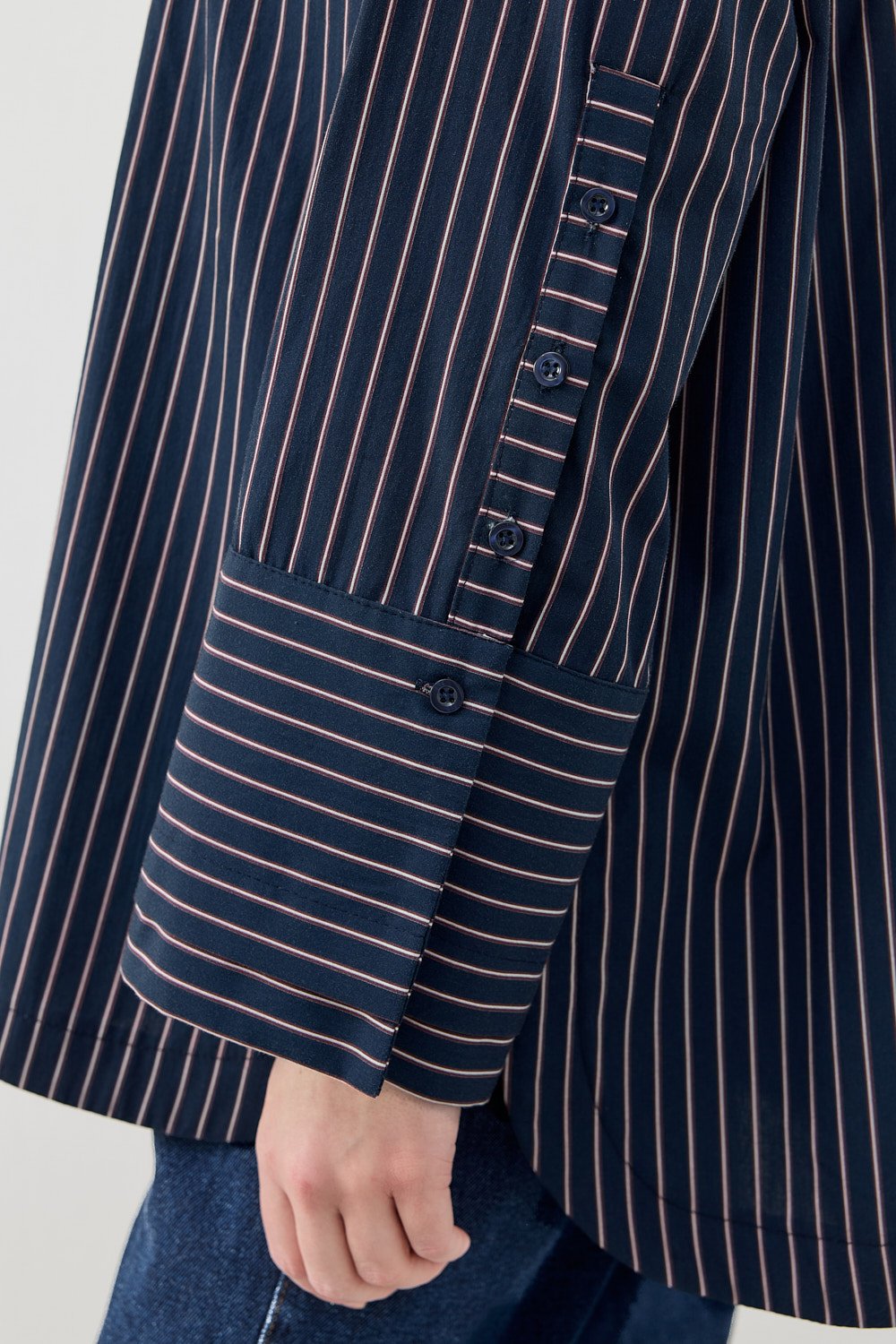 Model Detayı: Çizgili, oversize kesim, uzun kollu gömlek. Düğmeli tasarımı ve kontrast manşet detayı ile modern bir görünüm sunar.
