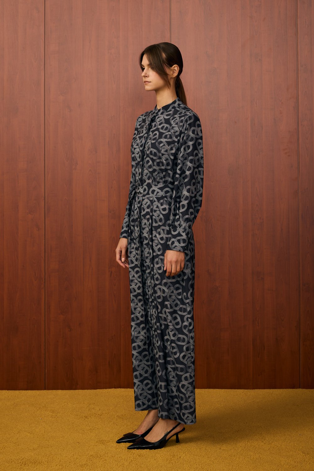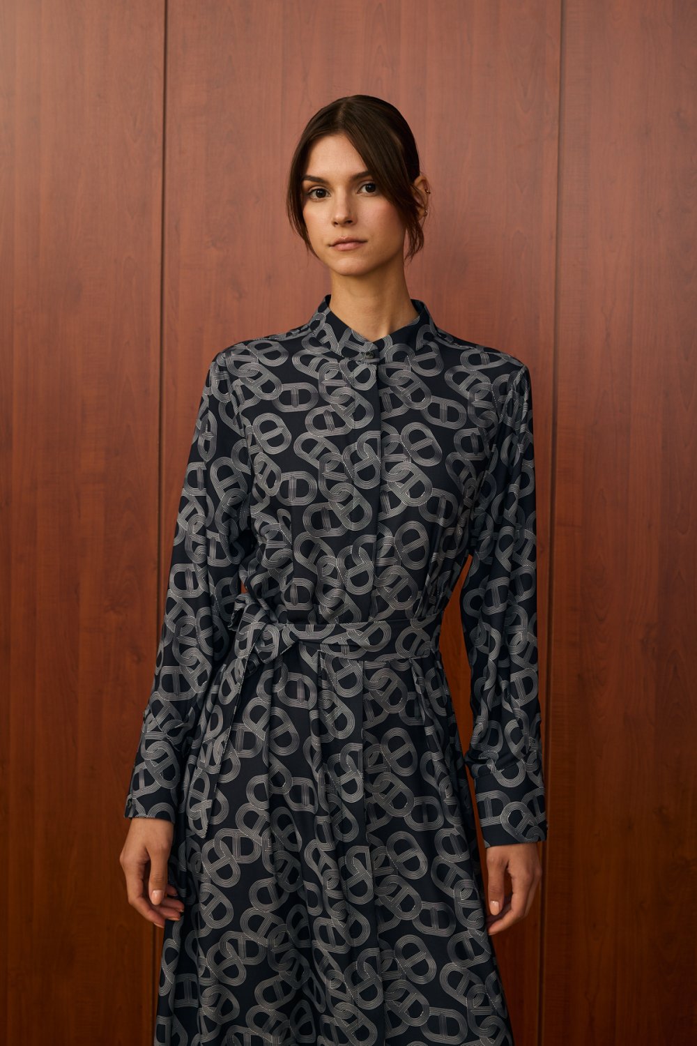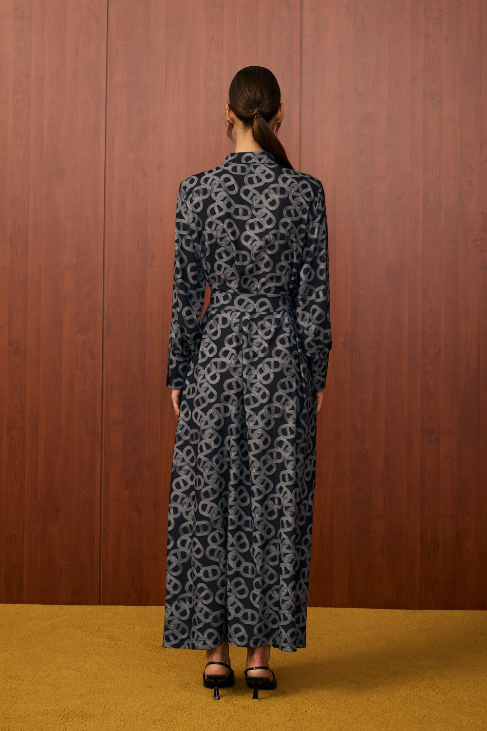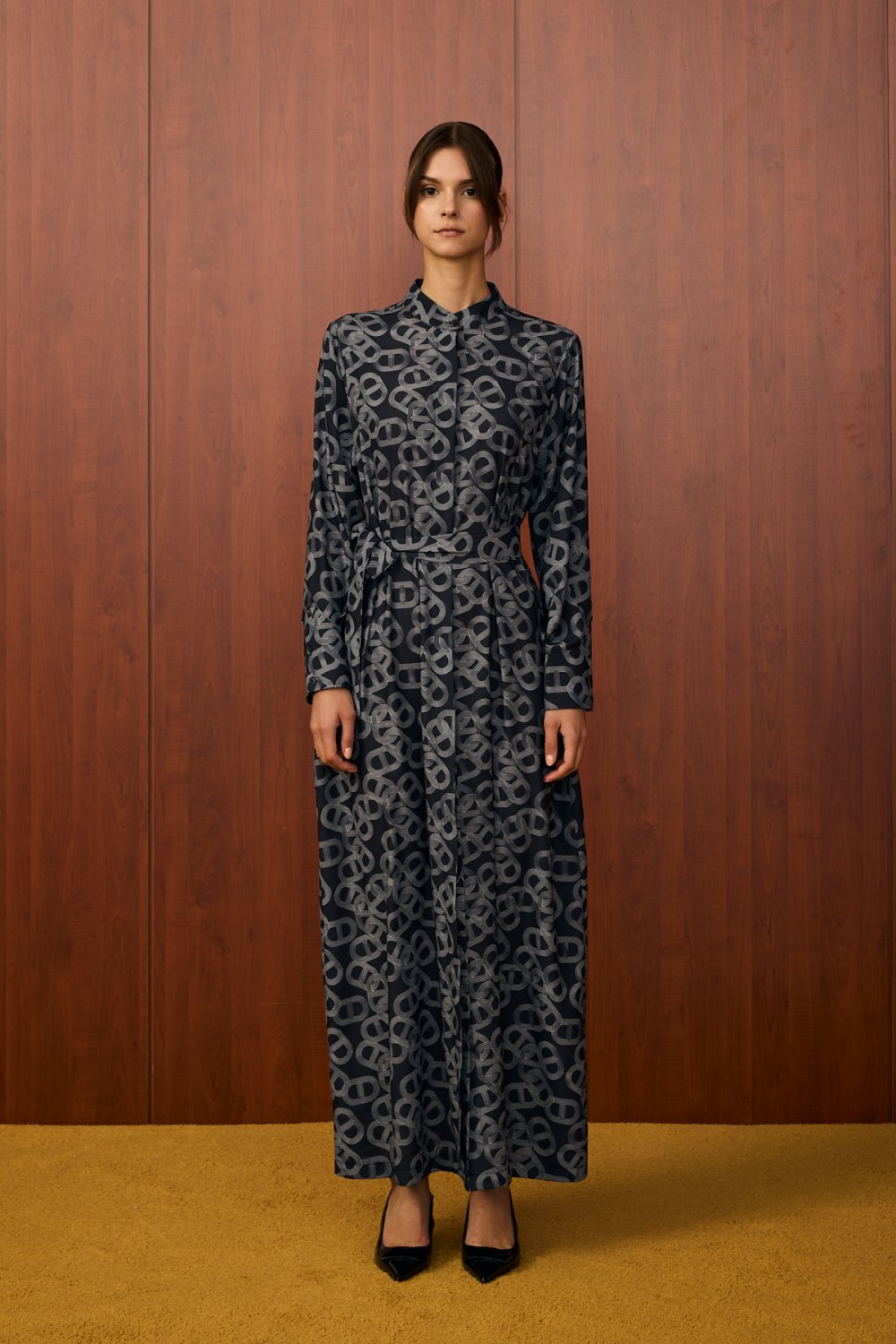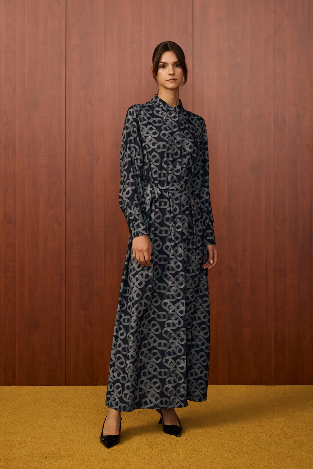 • Modern ve zarif bir duruş sergilemek isteyen kadınlar için tasarlanan bu elbise, dolabınızın en özel parçalarından biri olacak. İthal krep kumaştan üretilen elbise, dökümlü ve rahat yapısıyla gün boyu konfor sunar. Benzersiz zincir deseni, tasarıma dinamik ve sofistike bir hava katıyor. Klasik gömlek yaka detayı, önü boyunca uzanan düğmeleri ve belden oturtmalı kemer detayı ile vücudunuza zarif bir form kazandırabilirsiniz. Astarı sayesinde iç göstermez, bu sayede daha rahat bir kullanım sağlar.
