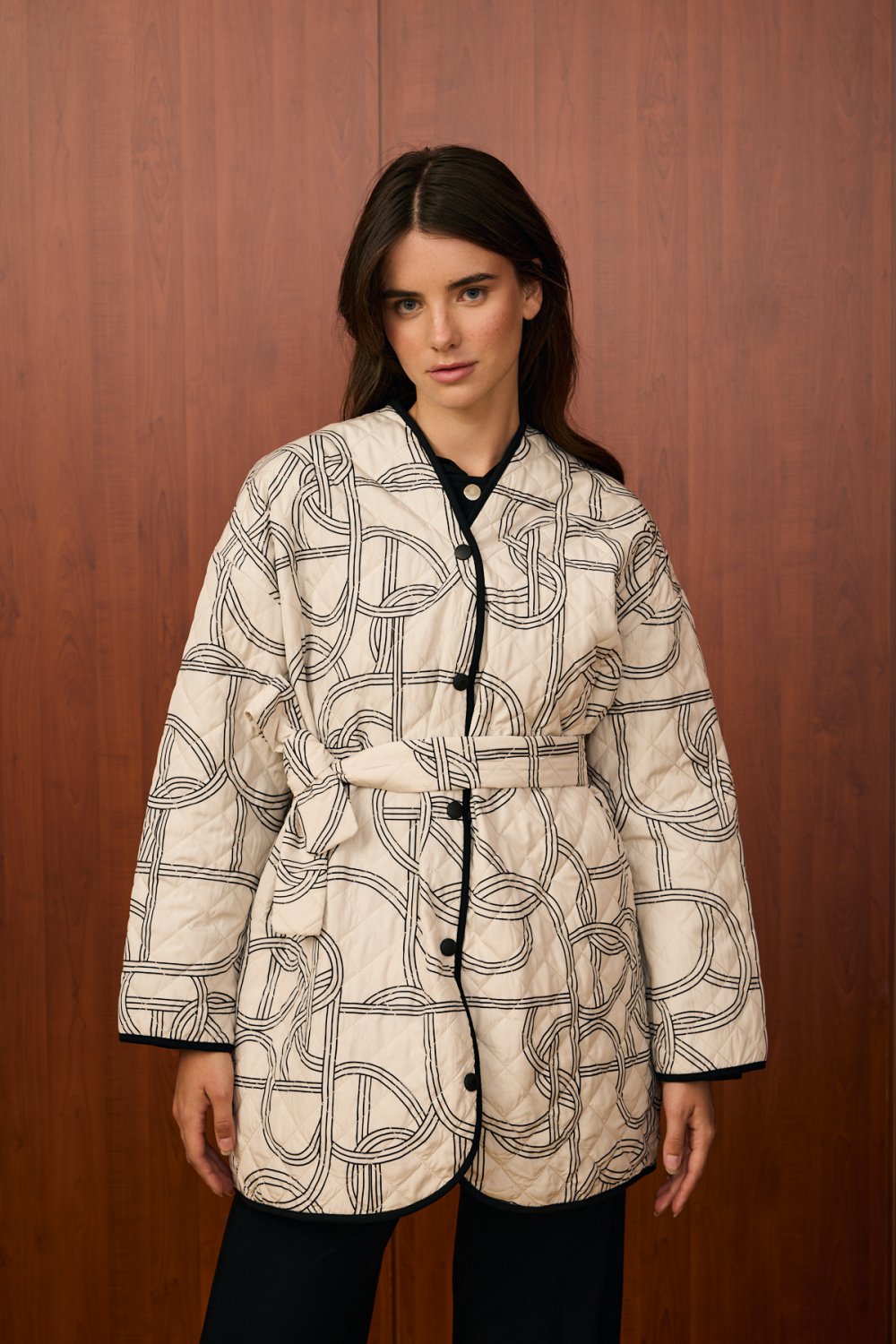 Gardırobunuza modern ve sanatsal bir dokunuş katacak olan bu kimono ceket ile tanışın. Özel baskılı polyester paraşüt kumaşı, hem hafif hem de şık bir kullanım sunarken, benzersiz deseniyle tüm dikkatleri üzerinize çeker. Kendinden kemerli tasarımı sayesinde belinizi vurgulayabilir ve cekete zarif bir form kazandırabilirsiniz. Siyah biyeli kenar detayları, bu parçanın modern ve sofistike görünümünü pekiştiriyor. İster özel davetlerde ister günlük kombinlerinizde kullanarak tarzınızı bir üst seviyeye taşıyabilirsiniz.