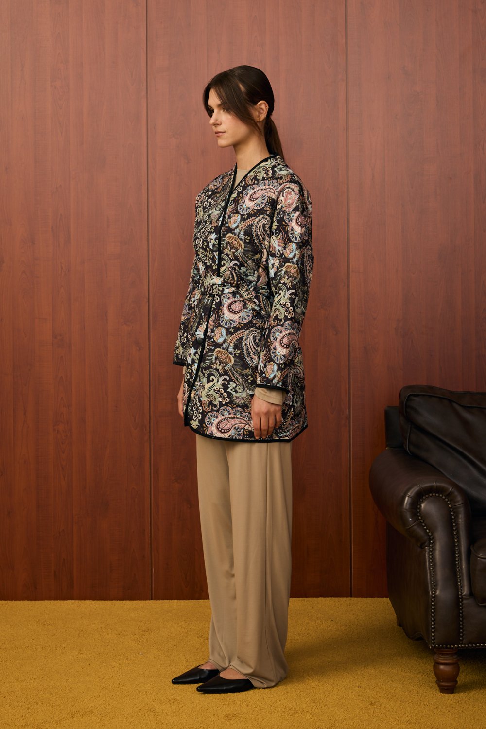 Gardırobunuza modern ve sanatsal bir dokunuş katacak olan bu kimono ceket ile tanışın. Özel baskılı polyester paraşüt kumaşı, hem hafif hem de şık bir kullanım sunarken, benzersiz deseniyle tüm dikkatleri üzerinize çeker. Kendinden kemerli tasarımı sayesinde belinizi vurgulayabilir ve cekete zarif bir form kazandırabilirsiniz. Siyah biyeli kenar detayları, bu parçanın modern ve sofistike görünümünü pekiştiriyor. İster özel davetlerde ister günlük kombinlerinizde kullanarak tarzınızı bir üst seviyeye taşıyabilirsiniz.