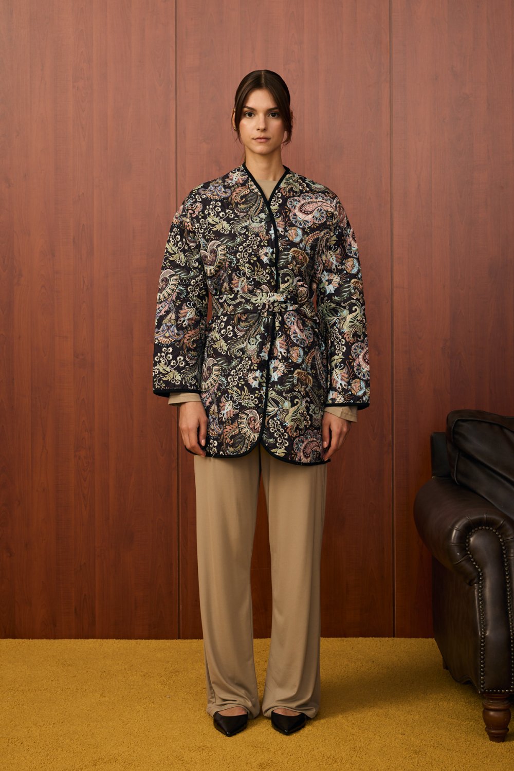• Detaylar: Kendinden kemer, siyah biye kenar detayları