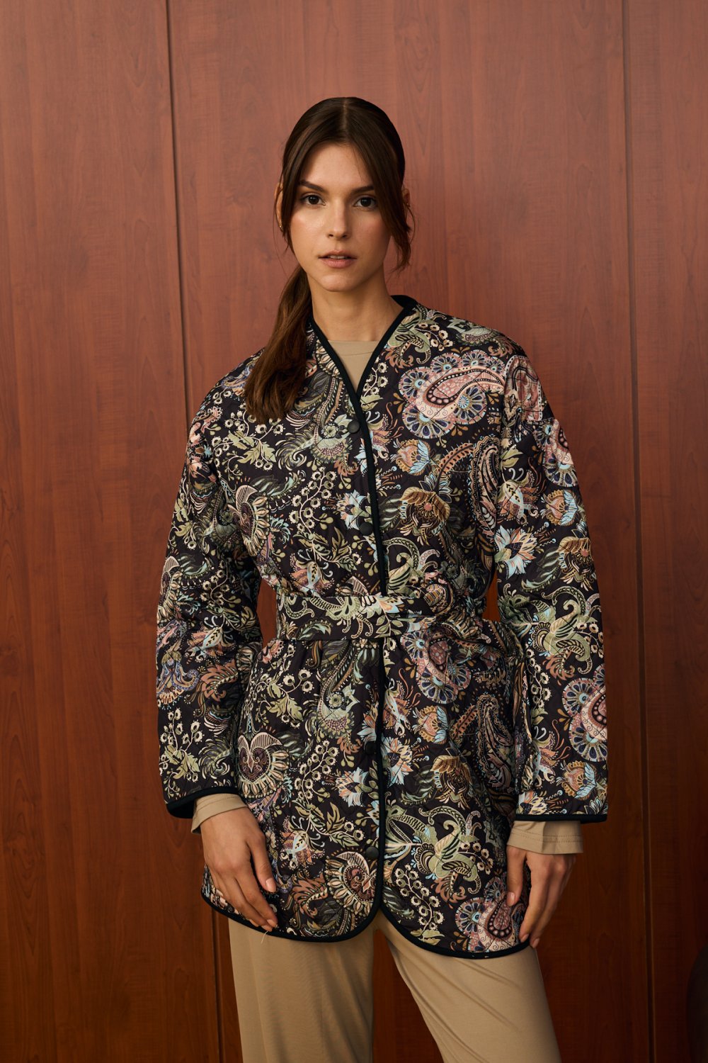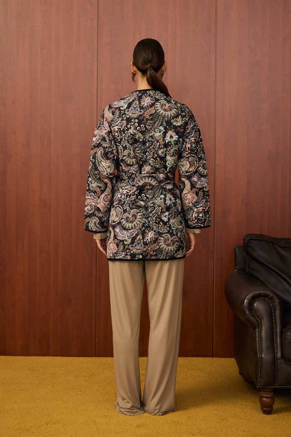 Gardırobunuza modern ve sanatsal bir dokunuş katacak olan bu kimono ceket ile tanışın. Özel baskılı polyester paraşüt kumaşı, hem hafif hem de şık bir kullanım sunarken, benzersiz deseniyle tüm dikkatleri üzerinize çeker. Kendinden kemerli tasarımı sayesinde belinizi vurgulayabilir ve cekete zarif bir form kazandırabilirsiniz. Siyah biyeli kenar detayları, bu parçanın modern ve sofistike görünümünü pekiştiriyor. İster özel davetlerde ister günlük kombinlerinizde kullanarak tarzınızı bir üst seviyeye taşıyabilirsiniz.