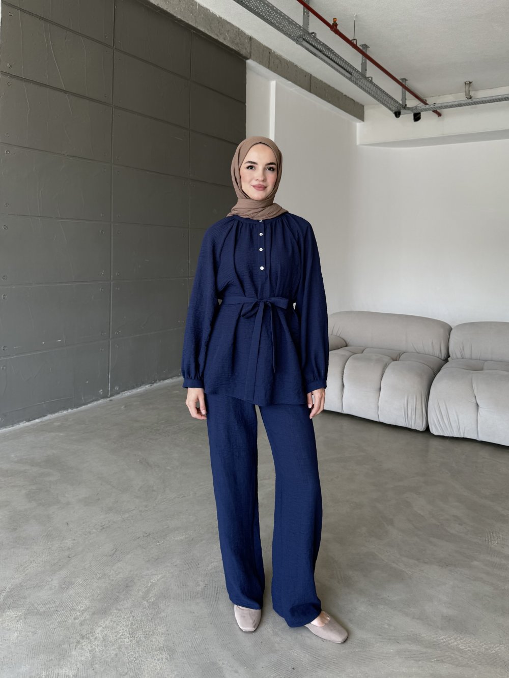 • Model Detayı: Rahat kesim, bol paça pantolon ve tunik uyumu