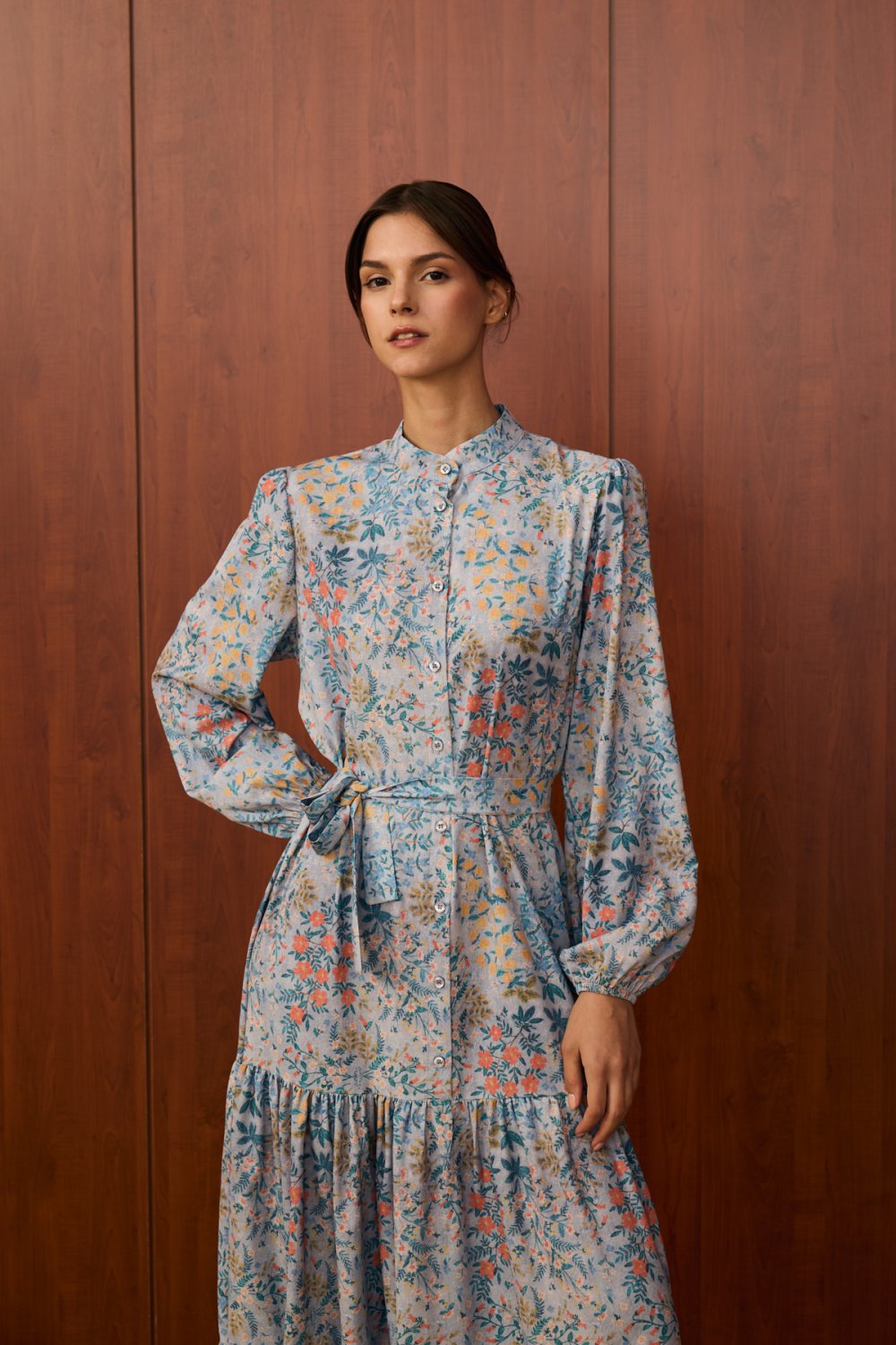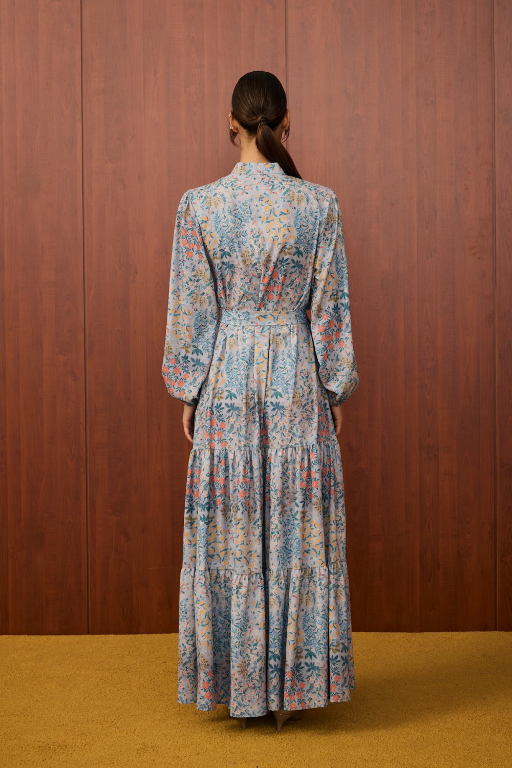 • Detaylar: Gömlek yaka, düğmeli ön kısım, belden kemerli tasarım ve katmanlı etek