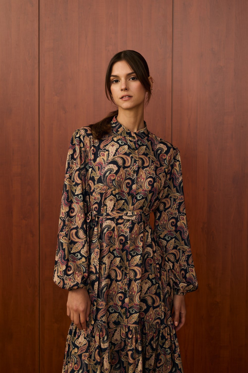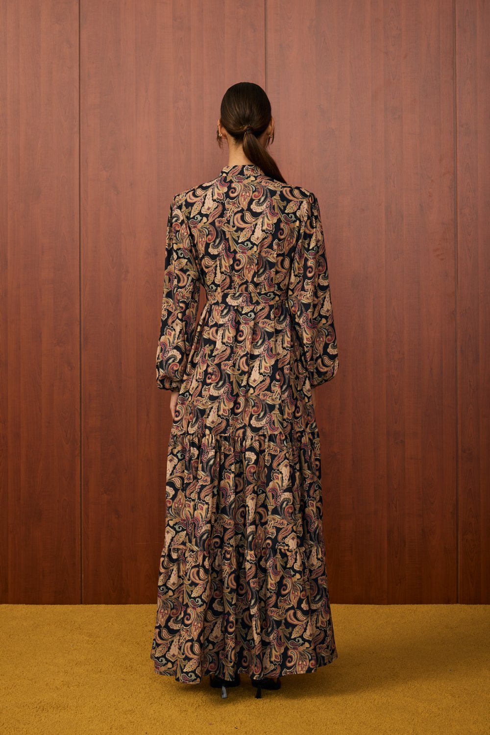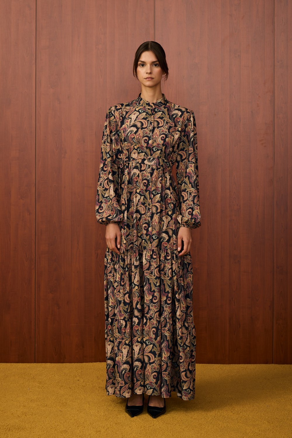 Detaylar: Gömlek yaka, düğmeli ön kısım, belden seyyar kemerli tasarım ve katmanlı etek