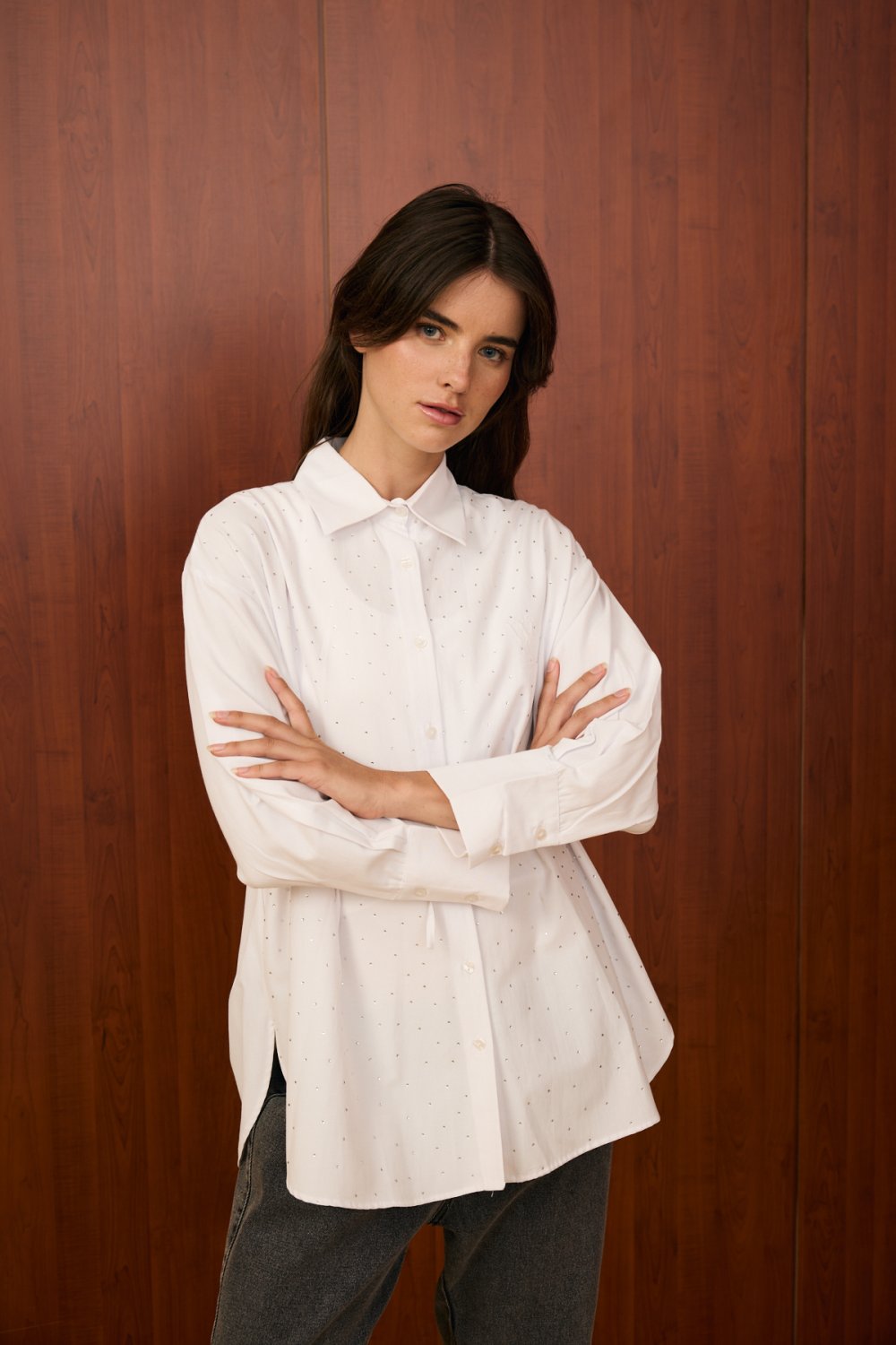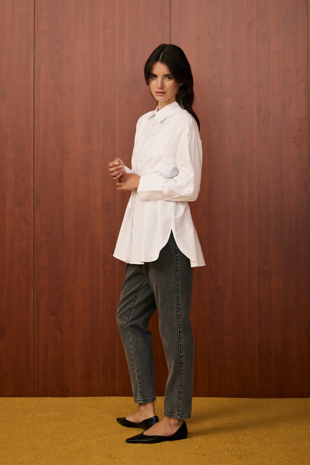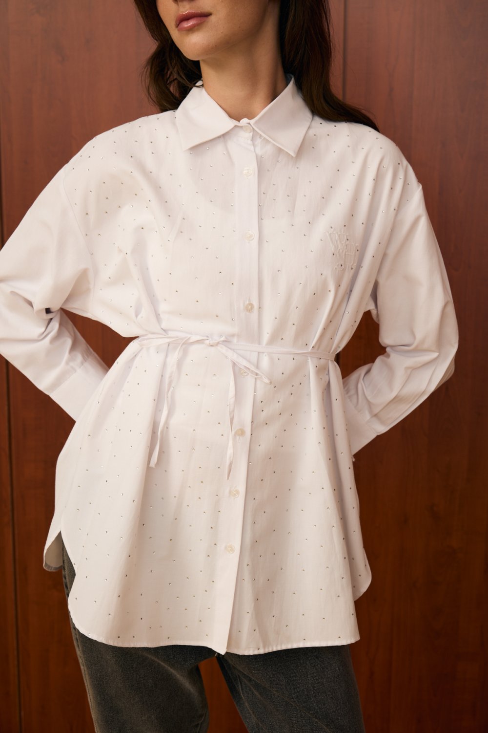 Model Detayı: Düğmeli, bele bağlanabilen ince kuşaklı, göğüs kısmında ve ön yüzeyinde taş/ışıltı detaylı gömlek. Uzun kollu ve klasik yakalıdır.