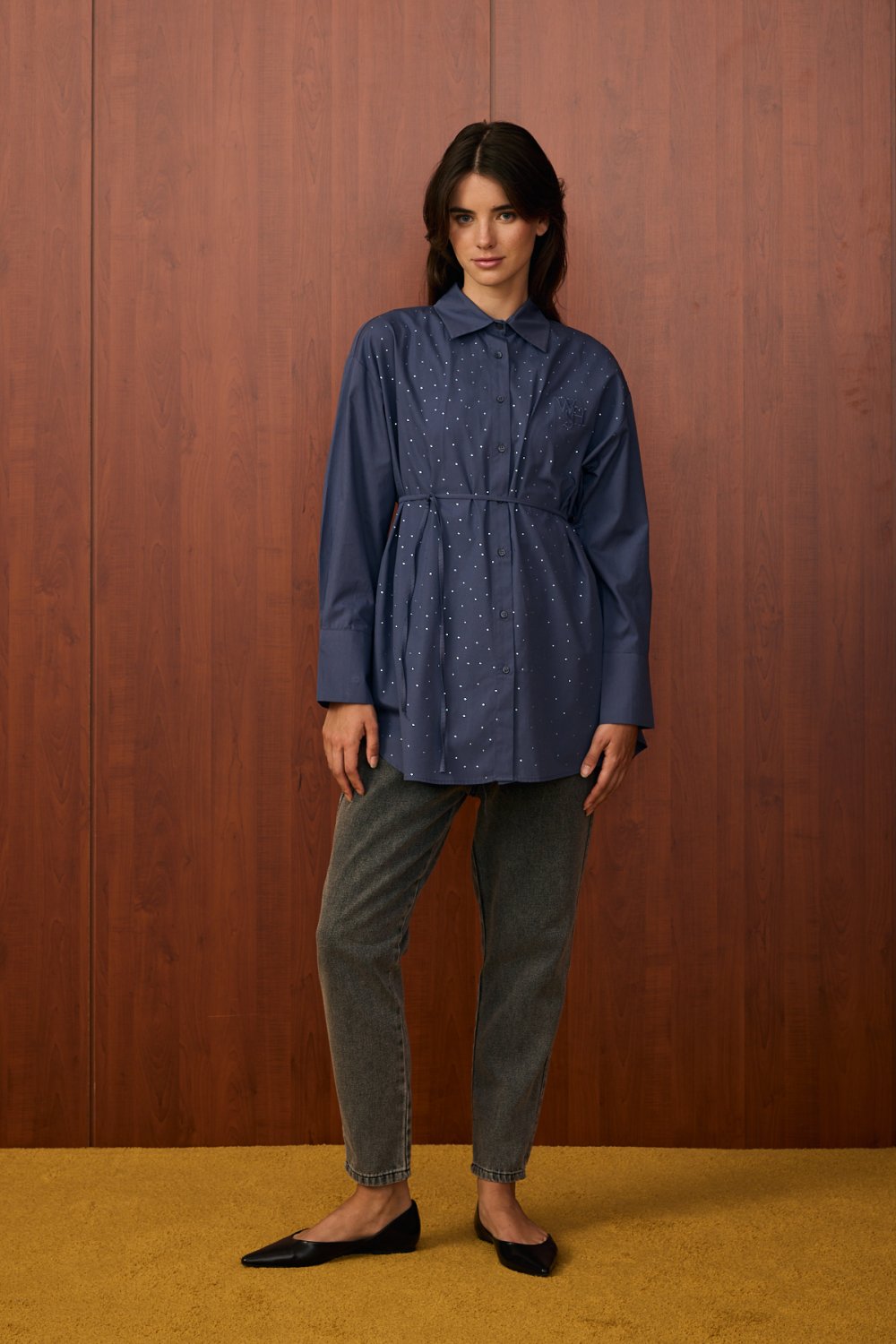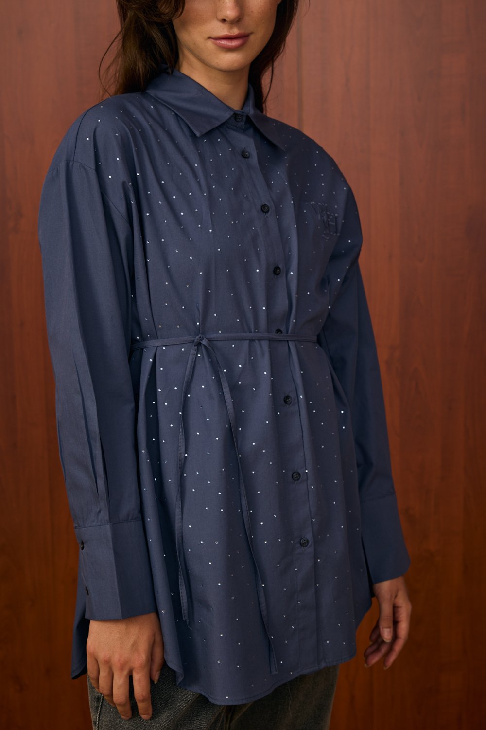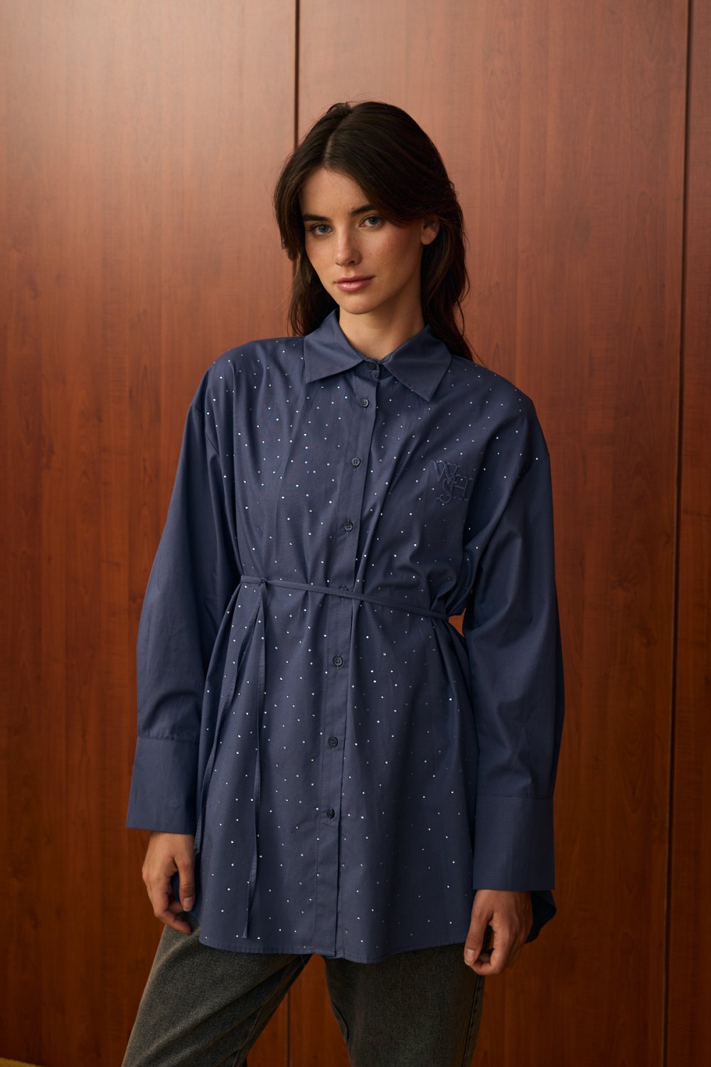 Model Detayı: Düğmeli, bele bağlanabilen ince kuşaklı, göğüs kısmında ve ön yüzeyinde taş/ışıltı detaylı gömlek. Uzun kollu ve klasik yakalıdır.