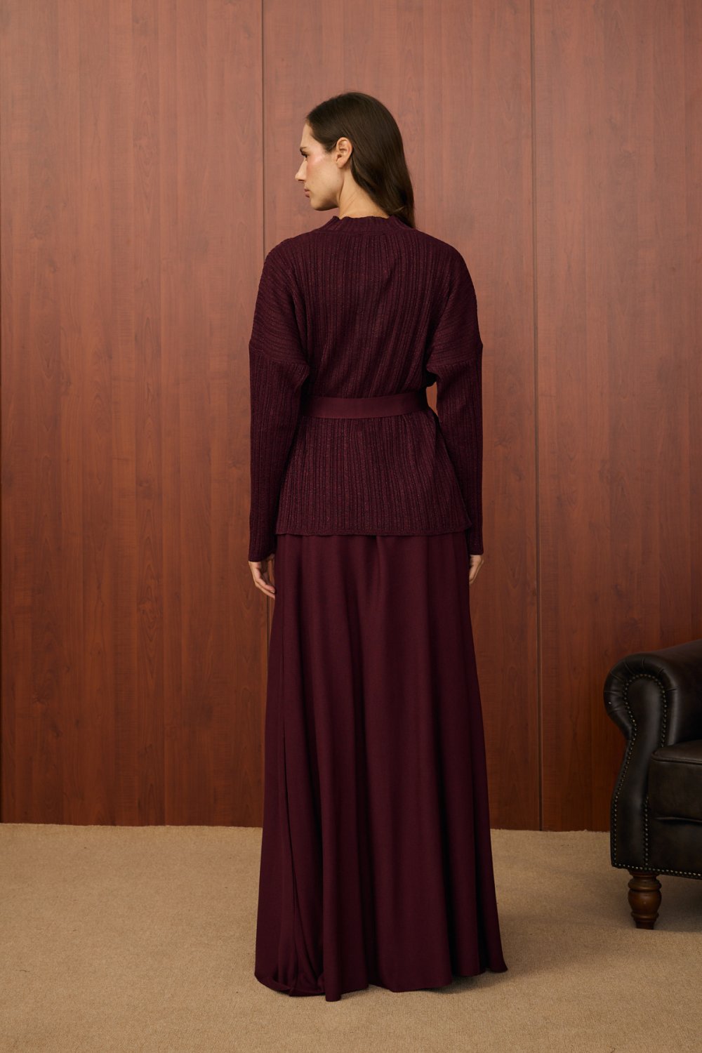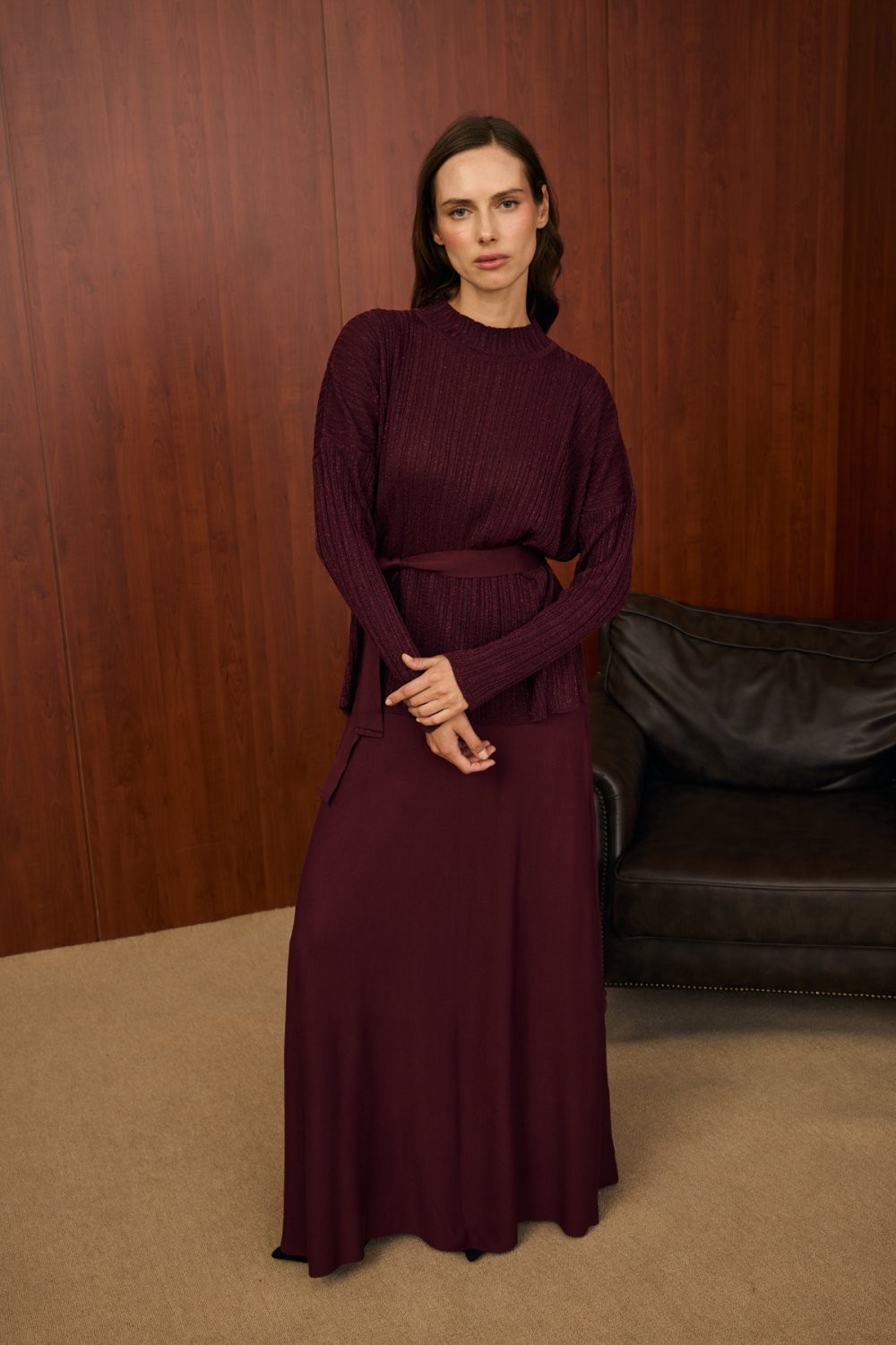 Ürün, simli dokusu sayesinde ışıltılı ve şık bir görünüme sahiptir. Üst parça uzun kollu ve bele oturan bir seyyar kuşakla tamamlanmıştır. Alt etek ise düz kesim ve uzun yapısıyla rahat kullanım sunar. Takım, hem günlük şıklıkta hem de özel günlerde tercih edilebilecek modern bir tasarıma sahiptir.