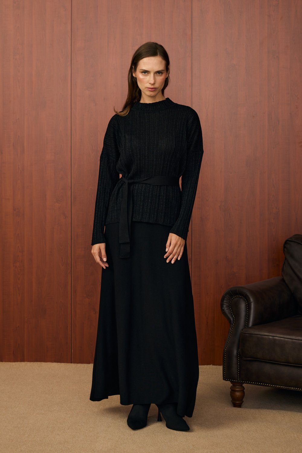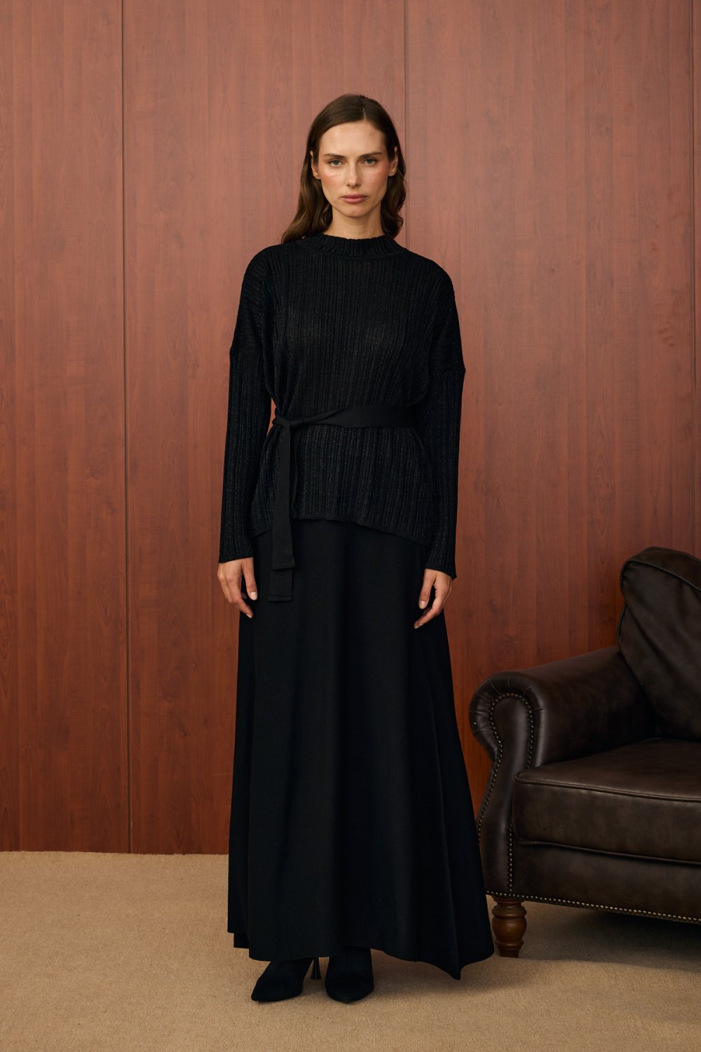Ürün, simli dokusu sayesinde ışıltılı ve şık bir görünüme sahiptir. Üst parça uzun kollu ve bele oturan bir seyyar kuşakla tamamlanmıştır. Alt etek ise düz kesim ve uzun yapısıyla rahat kullanım sunar. Takım, hem günlük şıklıkta hem de özel günlerde tercih edilebilecek modern bir tasarıma sahiptir.