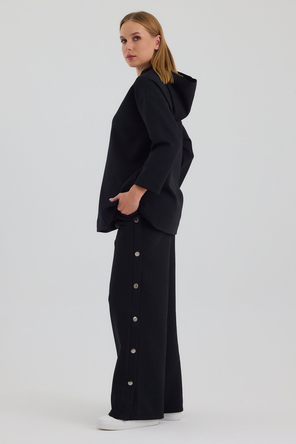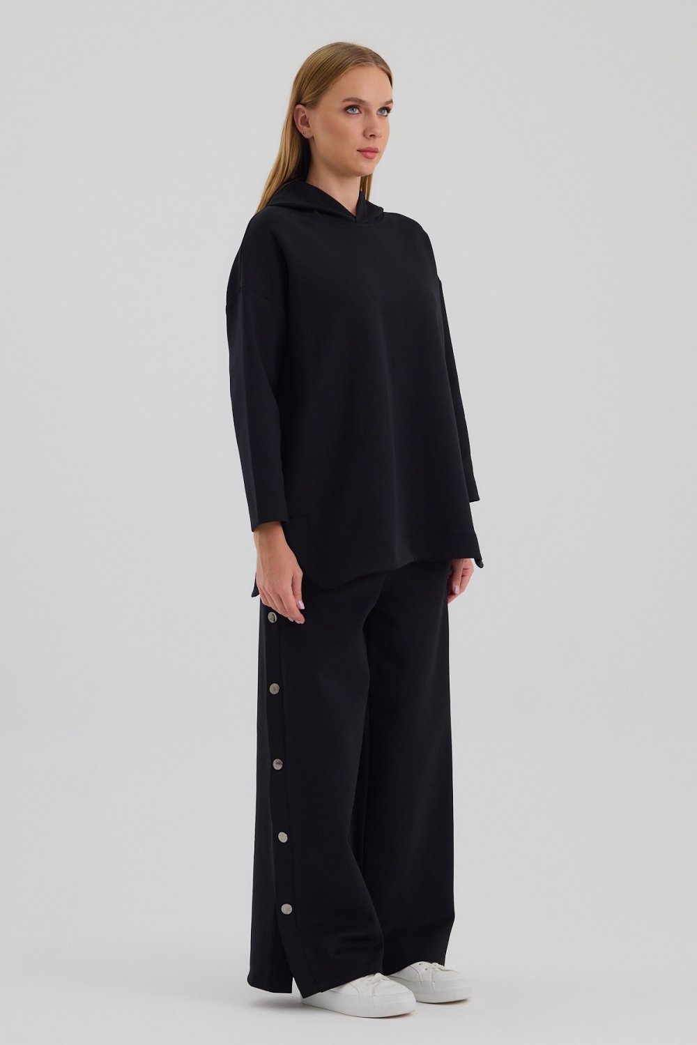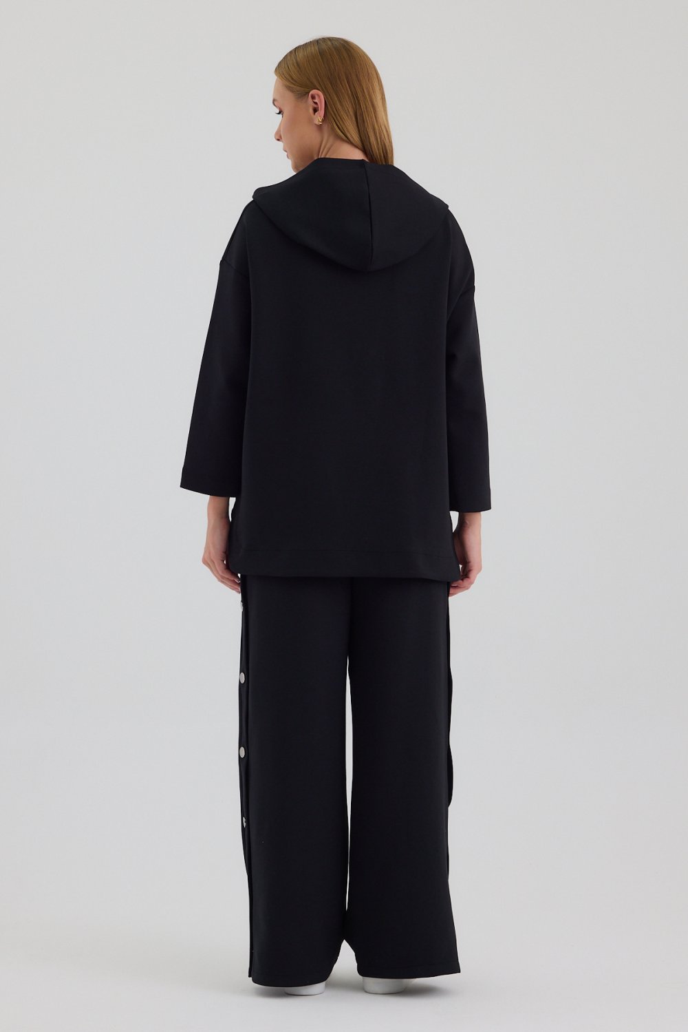 Siyah Üç İplik Kapüşonlu Üst ve Bol Pantolon Takımı