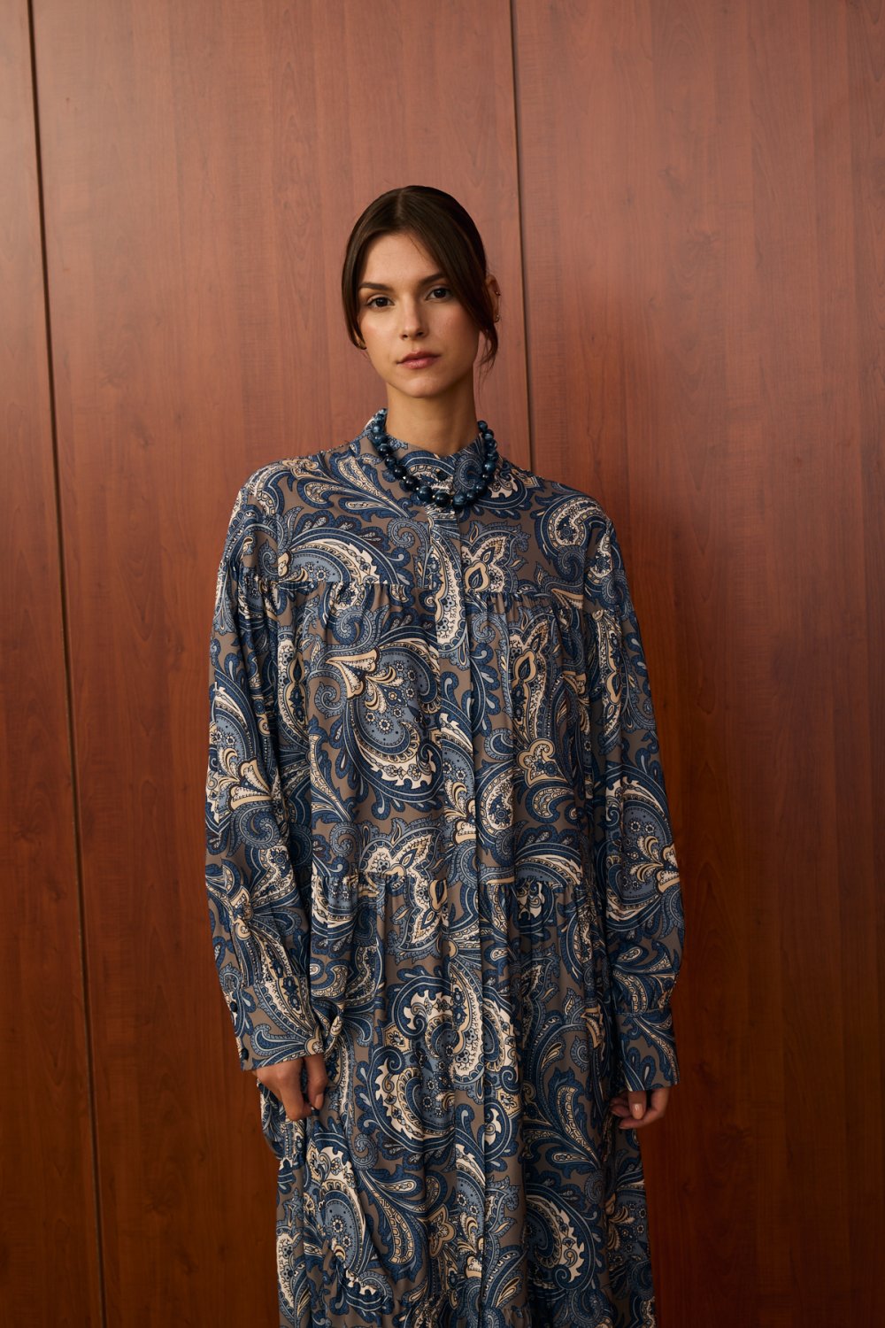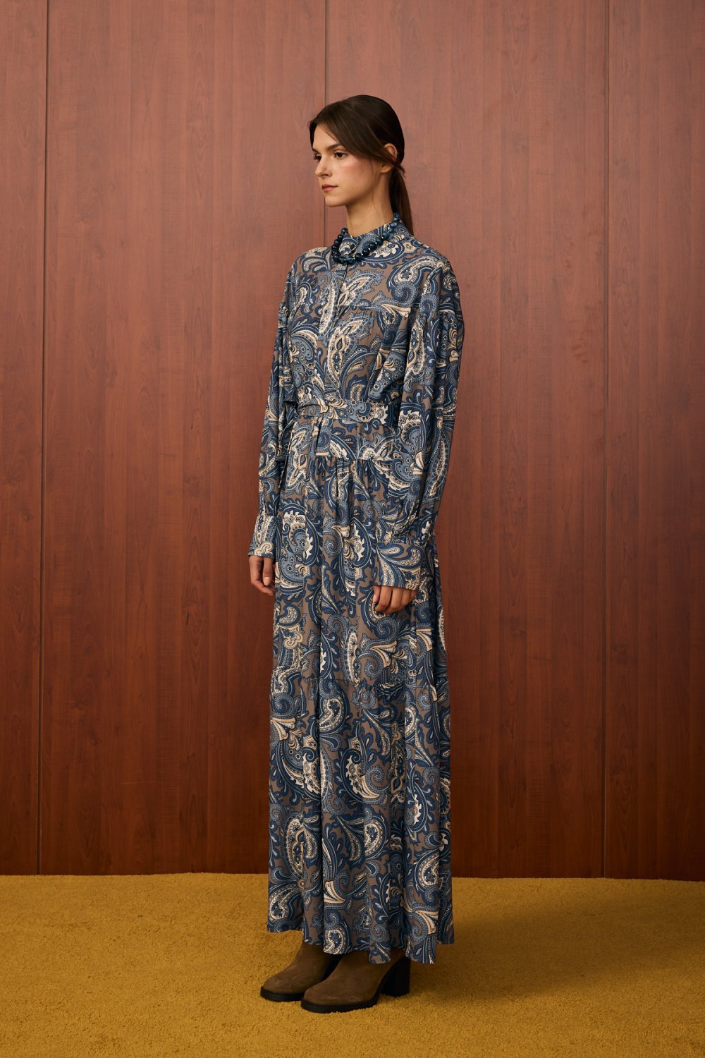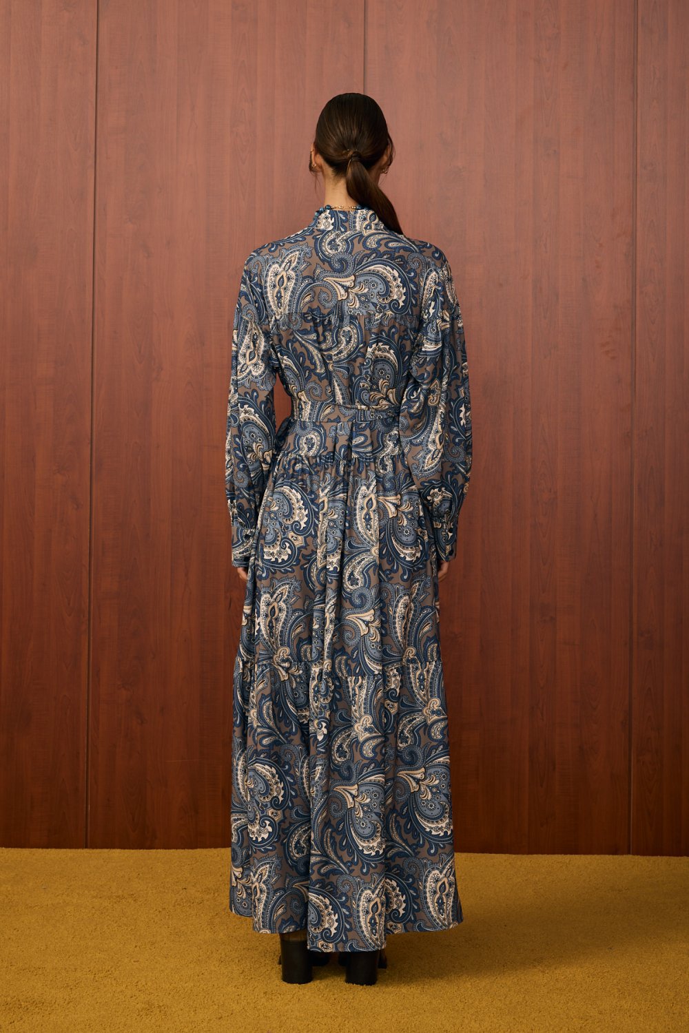 Detaylar: Gömlek yaka, belden oturtmalı tasarım, dökümlü etek