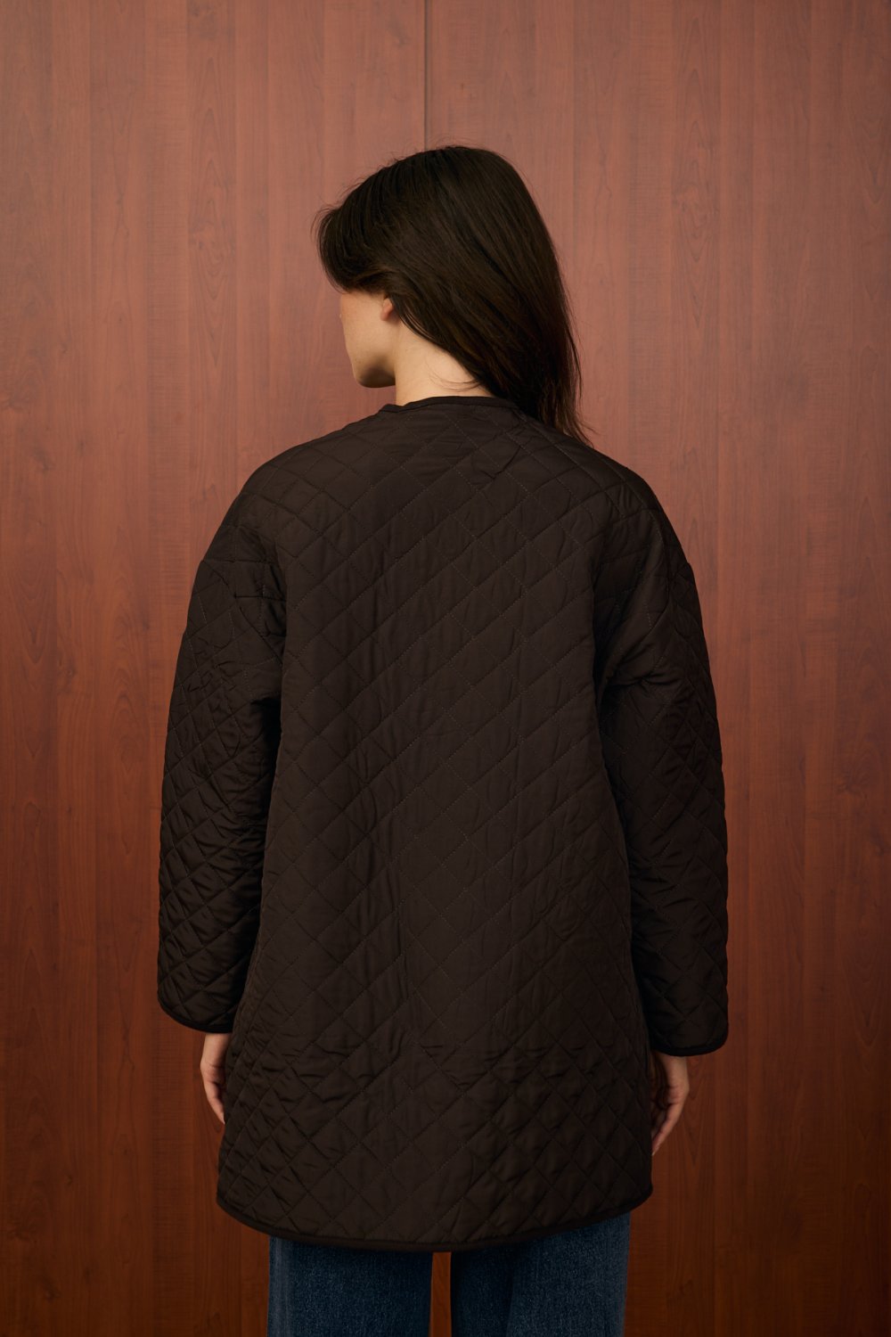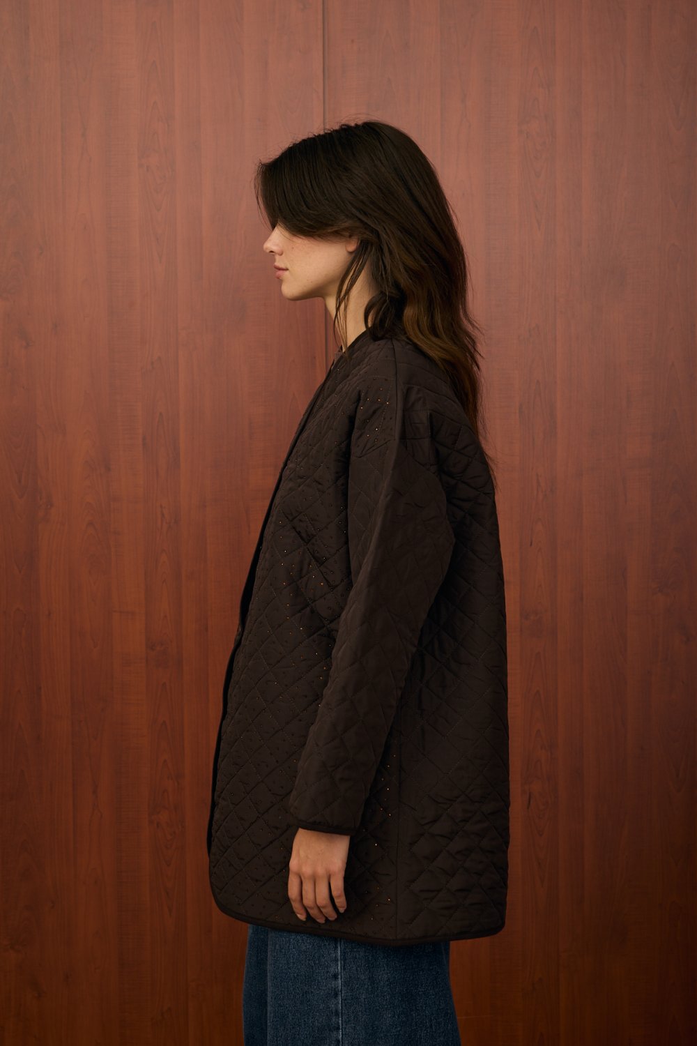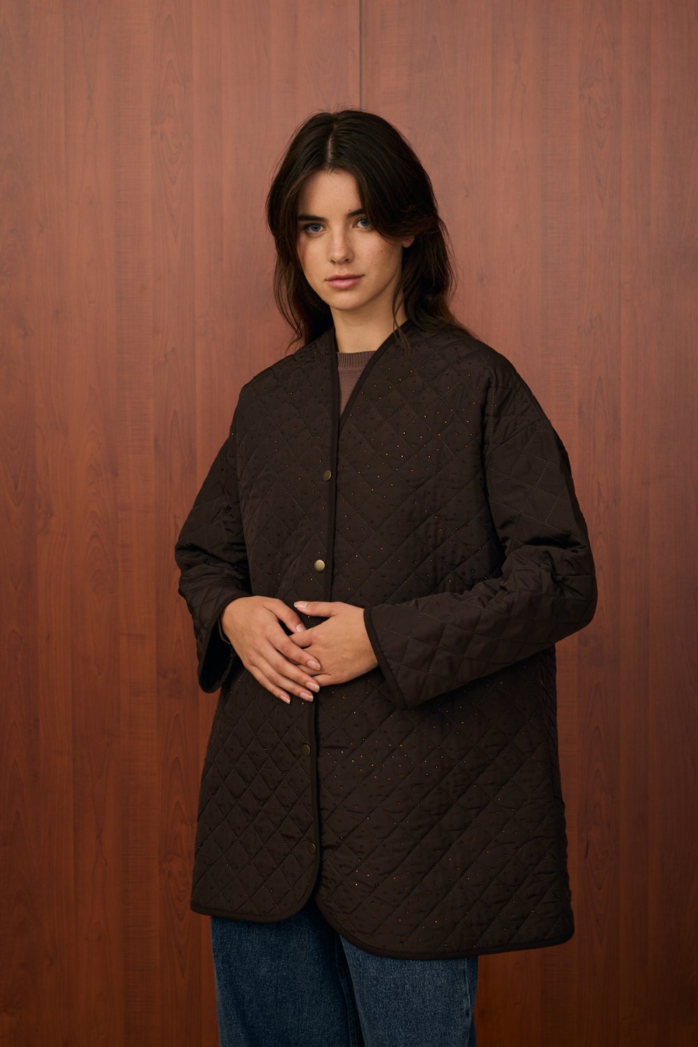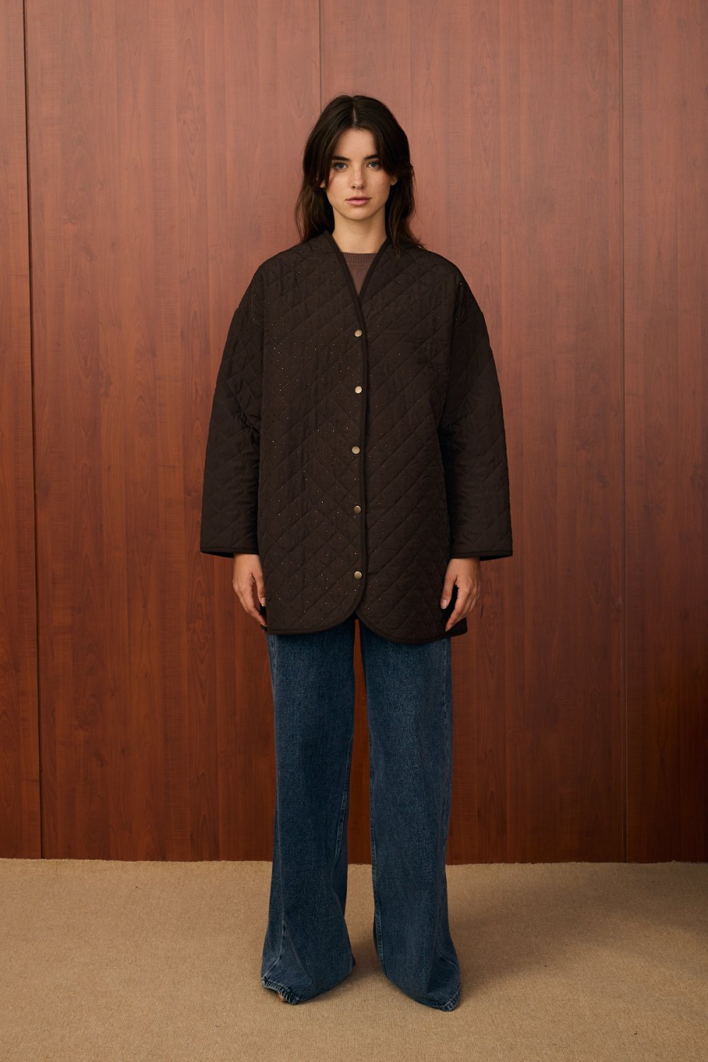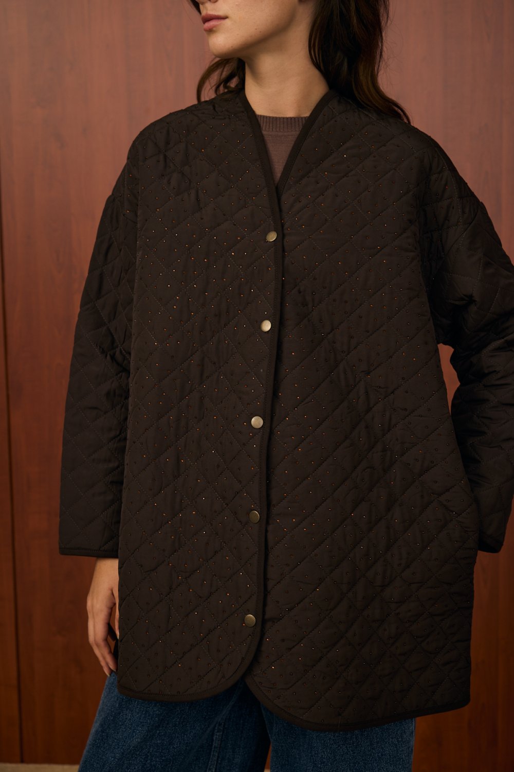 Kapitone detayları ve salaş kesimiyle dikkat çeken bu şık mont, mevsim geçişlerinde ideal bir tercihtir. Üzerindeki ince simli taş detayları ışıltılı bir görünüm katarken, çıtçıtlı ön kapama ise pratik kullanım sunar. Geniş kesimi ve dökümlü yapısıyla rahat bir tarz sağlar.