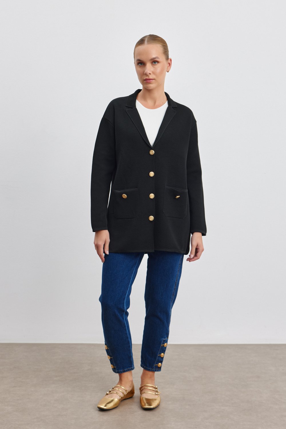Ürün Özeti: Yumuşak ve kaliteli pamuk iplikten üretilmiş bu şık triko ceket, hem şıklık hem de konforu bir arada sunar. Günlük kullanıma uygun olan bu ceket, 75 cm uzunluğu ve modern kesimi ile tarzınıza zarif bir dokunuş katar. Cep detayları ve düğmeleri ile de fonksiyonel ve şık bir görünüme sahiptir.