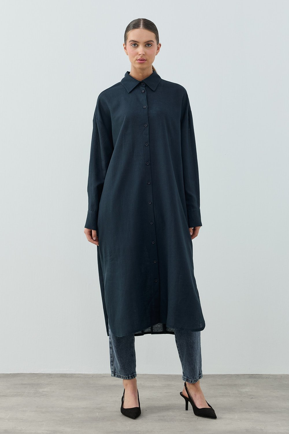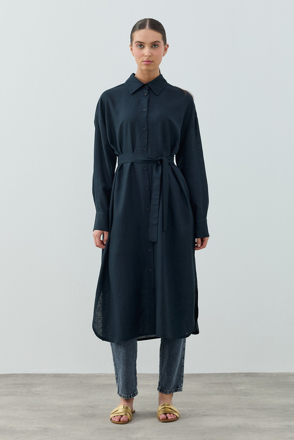 Uzun Keten Gömlek-Lacivert